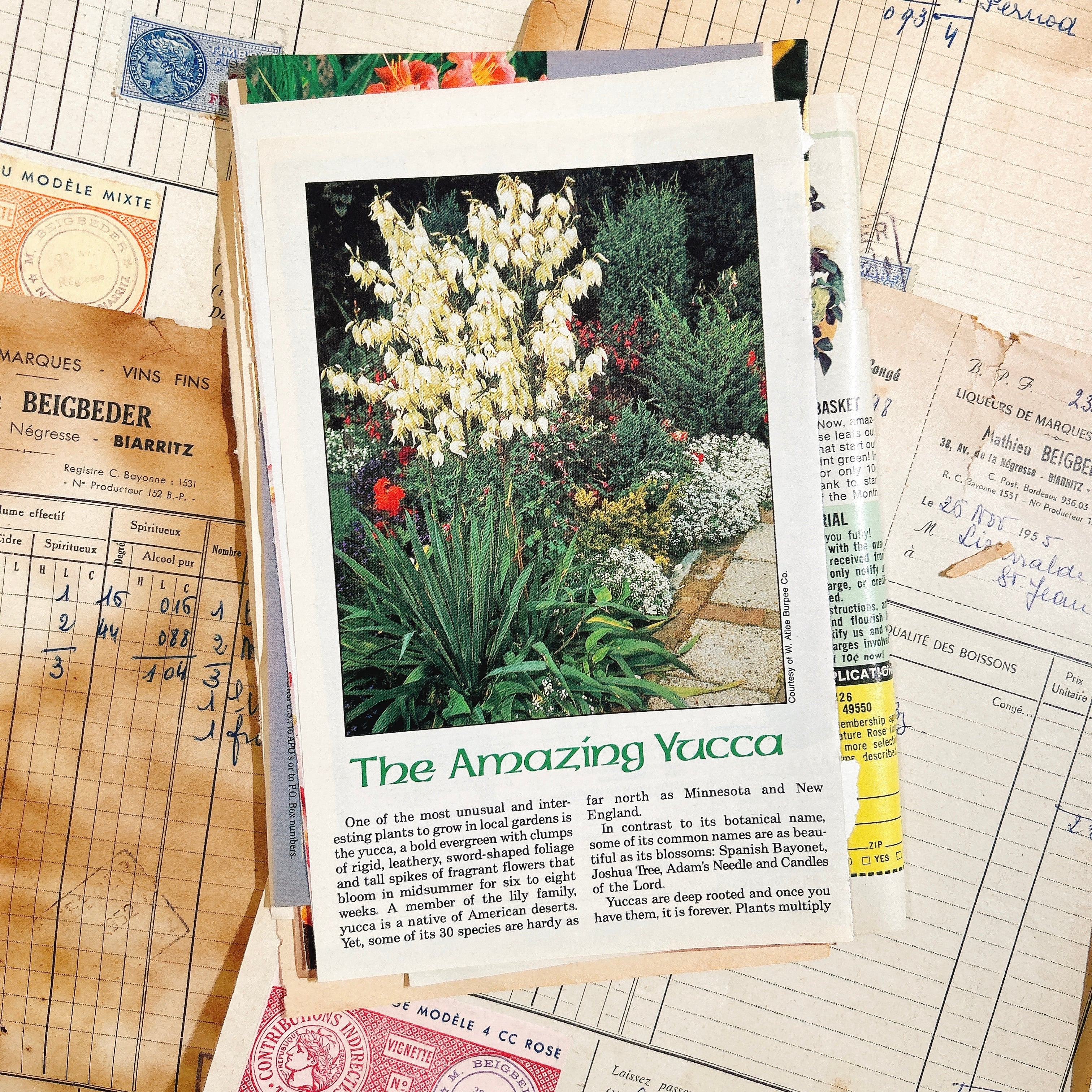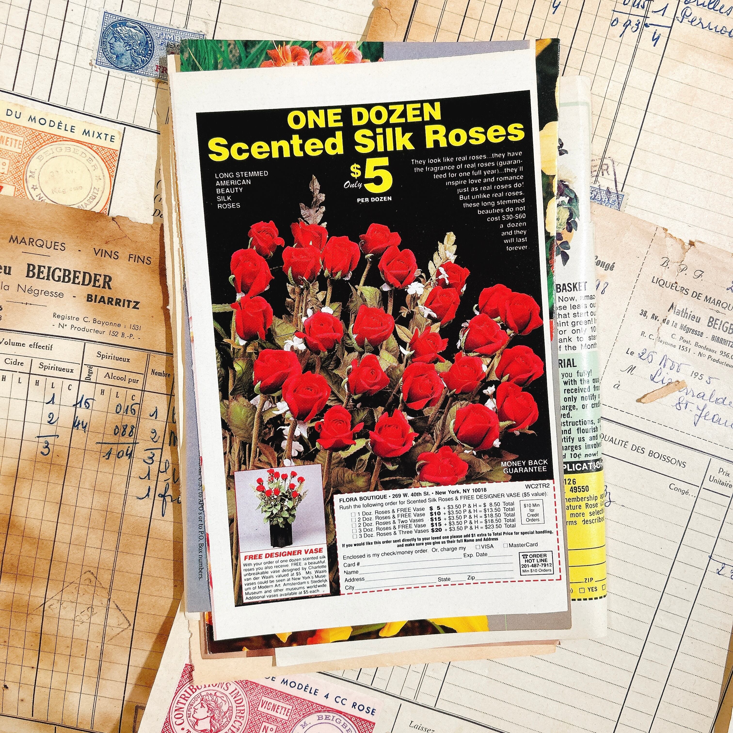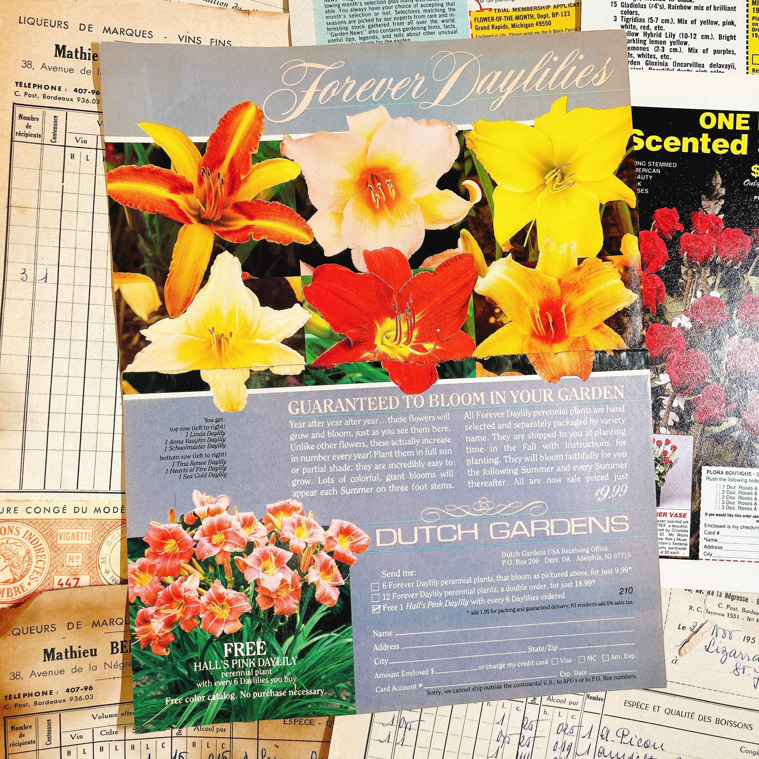 アメリカの家庭誌や園芸カタログから切り抜かれた、花々の魅力が詰まったヴィンテージペーパー10枚セットです。チューリップ、ユッカ、デイリリー、ローズなど、色鮮やかな花々が紙面いっぱいに咲き誇り、英語の広告文や価格表示、当時の印刷インクの風合いがそのまま残っています。1950〜70年代頃のアメリカらしい色使いやフォント、レイアウトが特徴で、どの1枚もグラフィックとしての完成度が高く、見るだけで当時の生活や庭の香りを感じられます。