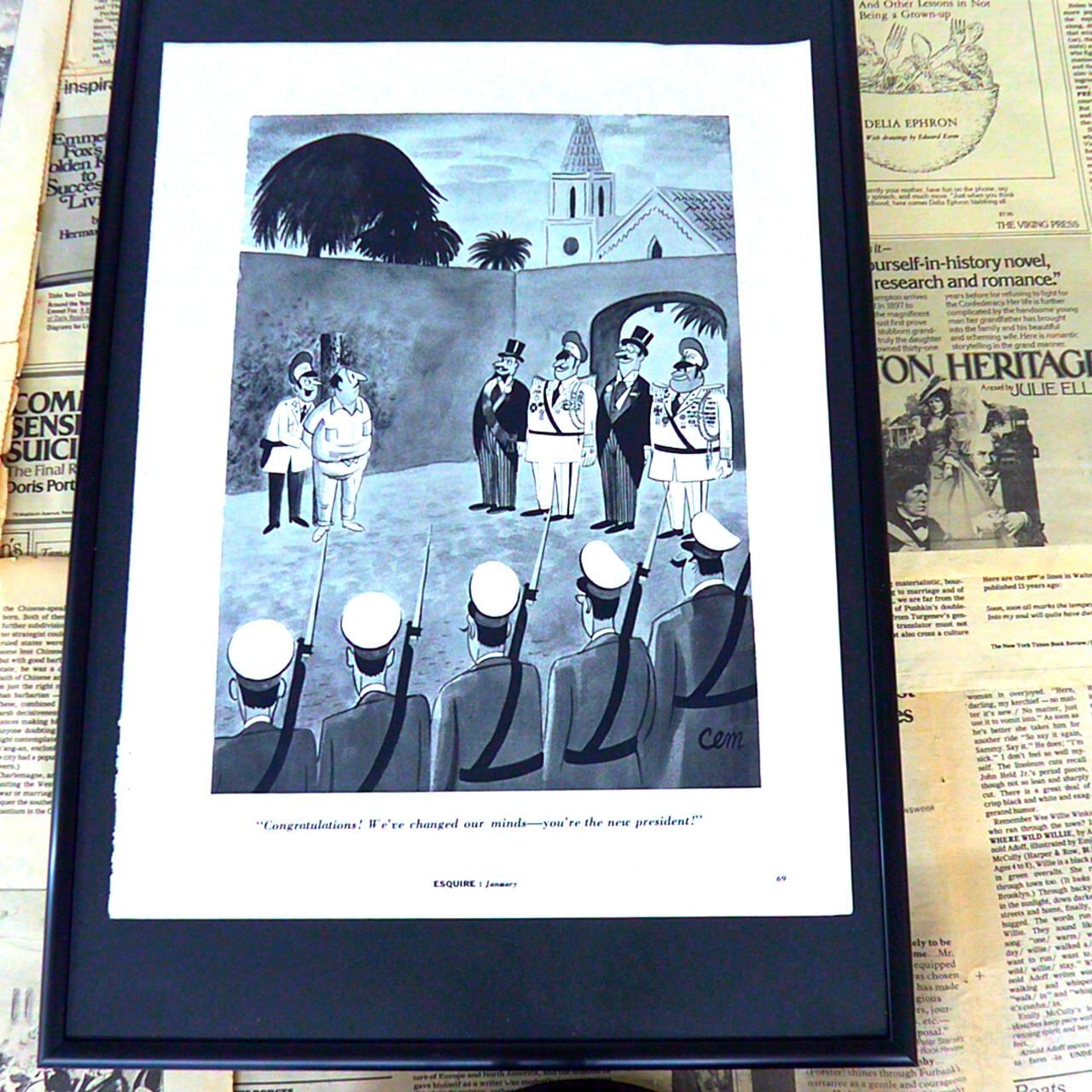 このイラストは、風刺的な内容を持つユーモラスな作品です。舞台は南国のような屋外で、軍服やシルクハットの男性たちが一列に並び、向かいには一人の一般的な男性が立っています。手前には銃を持った兵士たちが並び、緊迫感のある雰囲気を醸し出しています。キャプションには「おめでとう!気が変わったから、君が新しい大統領だ!」と記されており、これはクーデターや政権交代の不安定さ、権力者たちの気まぐれさを皮肉っています。イラスト全体からは、権力を巡る滑稽な人間模様と、その背後にある社会的な問題への鋭い観察眼が伝わってきます。1970年代の『ESQUIRE』誌らしい、知的かつユーモラスな時事風刺を楽しめる一枚です。