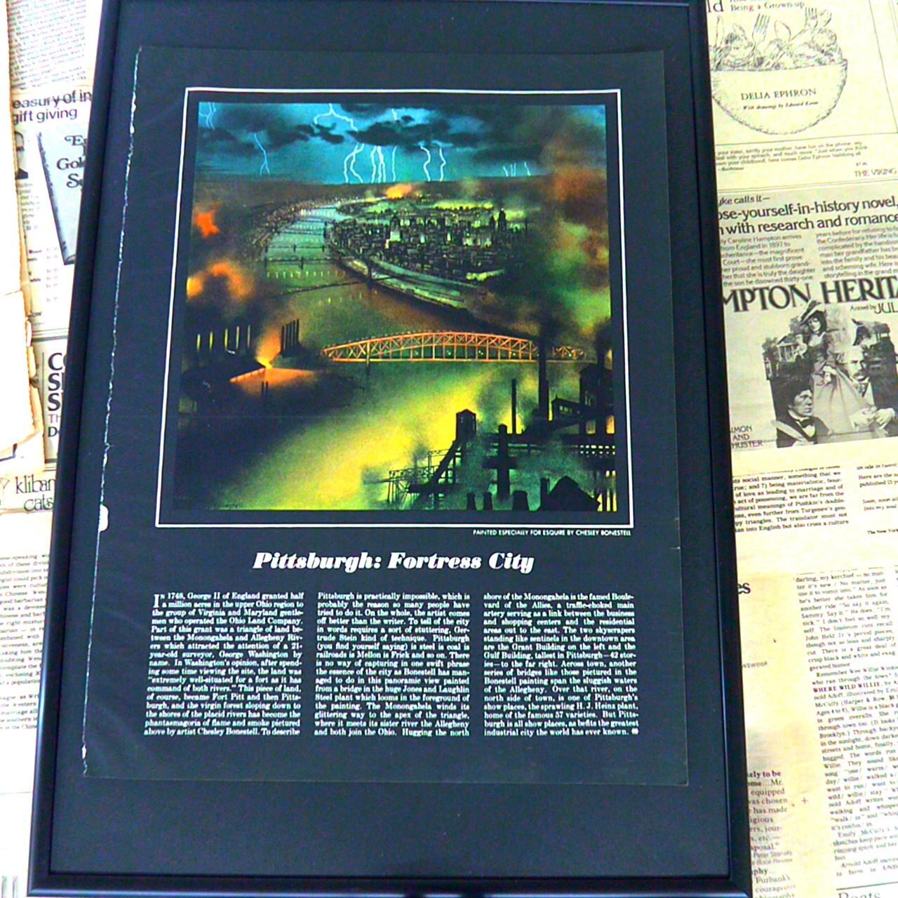 このイラストは、チャーリー・ボナステルによって描かれたもので、アメリカ合衆国ペンシルバニア州ピッツバーグの都市景観を独特な色彩と構成で表現しています。画面中央には、煙と霧に包まれたピッツバーグのダウンタウンや川、それを囲む工場や橋が描かれており、都市の産業的な力強さと歴史的な重厚感を強調しています。背景には雷光が激しく輝き、都市を取り巻く自然の脅威と、それに抗う人間の営みがドラマチックに対比されています。このイラストは、ピッツバーグが「要塞都市」と呼ばれる所以――川に囲まれた地形、重要な交通の要衝、そして産業の発展――を視覚的に表現しており、19世紀から20世紀にかけてのアメリカ都市のダイナミズムと社会背景を感じさせます。産業都市としての繁栄の象徴である煙突や橋梁のシルエットは、時代を超えてピッツバーグのアイデンティティを伝える美しい一枚です。