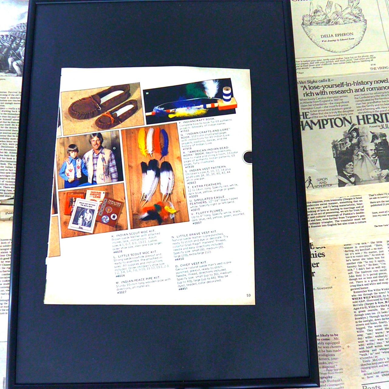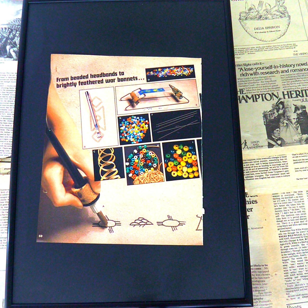このページは、ビーズワークやネイティブ・アメリカンに伝わる工芸品の制作プロセスや素材を紹介するイラスト記事の一部です。上部にはビーズや装飾用の羽根、糸などの素材が並び、実際に手作業で工芸品が作られている様子が大きな写真で描かれています。特に印象的なのは、手にしたパイプ状の道具を使って平らな面に模様を描いている場面で、下部には複数の伝統的なモチーフの図案が描かれています。色とりどりのビーズの写真や、ビーズ細工を象徴するような螺旋状のパーツ、そして出来上がった装飾品の一例がコラージュのように並び、手作りの温かみと文化的な背景を感じさせます。キャプションも含め、民族的な美術や伝統工芸の魅力を伝える内容となっており、見ているだけでも自分で作ってみたくなるようなクリエイティブなインスピレーションを与えてくれます。