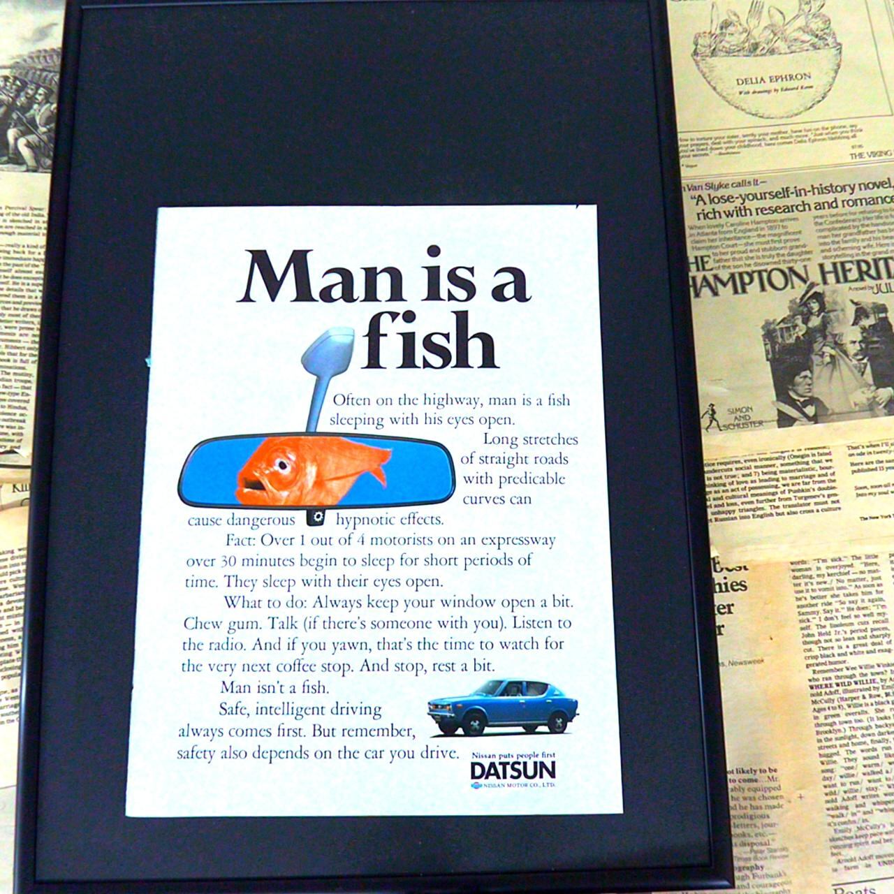 DATSUN(ダットサン)は、日本の日産自動車が展開していた自動車ブランドです。1914年に初代モデルが誕生し、1958年以降は海外市場で数多くの車を販売。特に1970年代には北米市場で高い評価を受け、コンパクトで信頼性の高い車を提供しました。革新的な技術と手頃な価格、堅実な走行性能が特徴で、多くのユーザーに愛されました。この広告も、安全運転と車の信頼性をユーモラスに訴求しているのが印象的です。