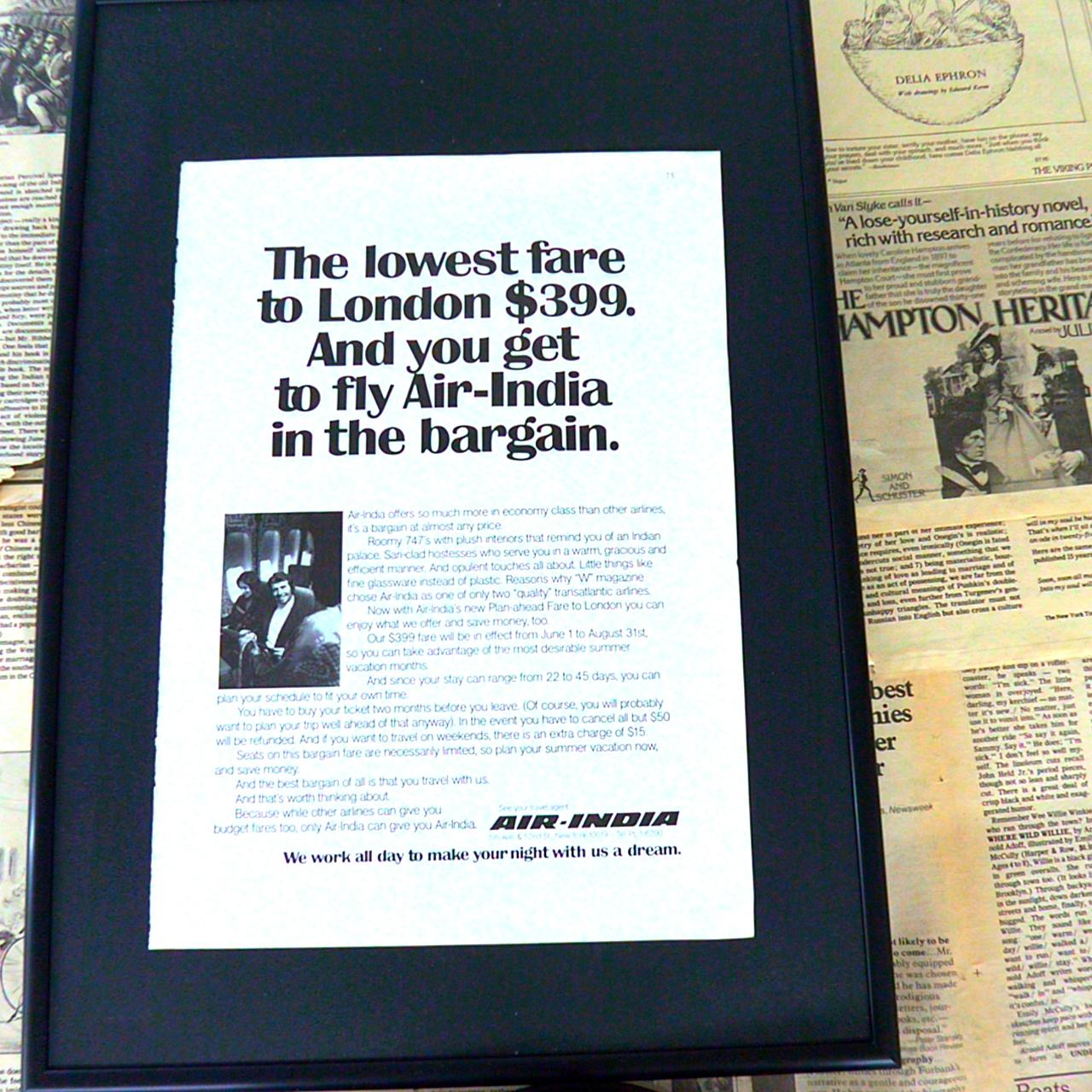 Air Indiaの広告切り抜きです。1970年代のNYTから切り抜いたものとなります。