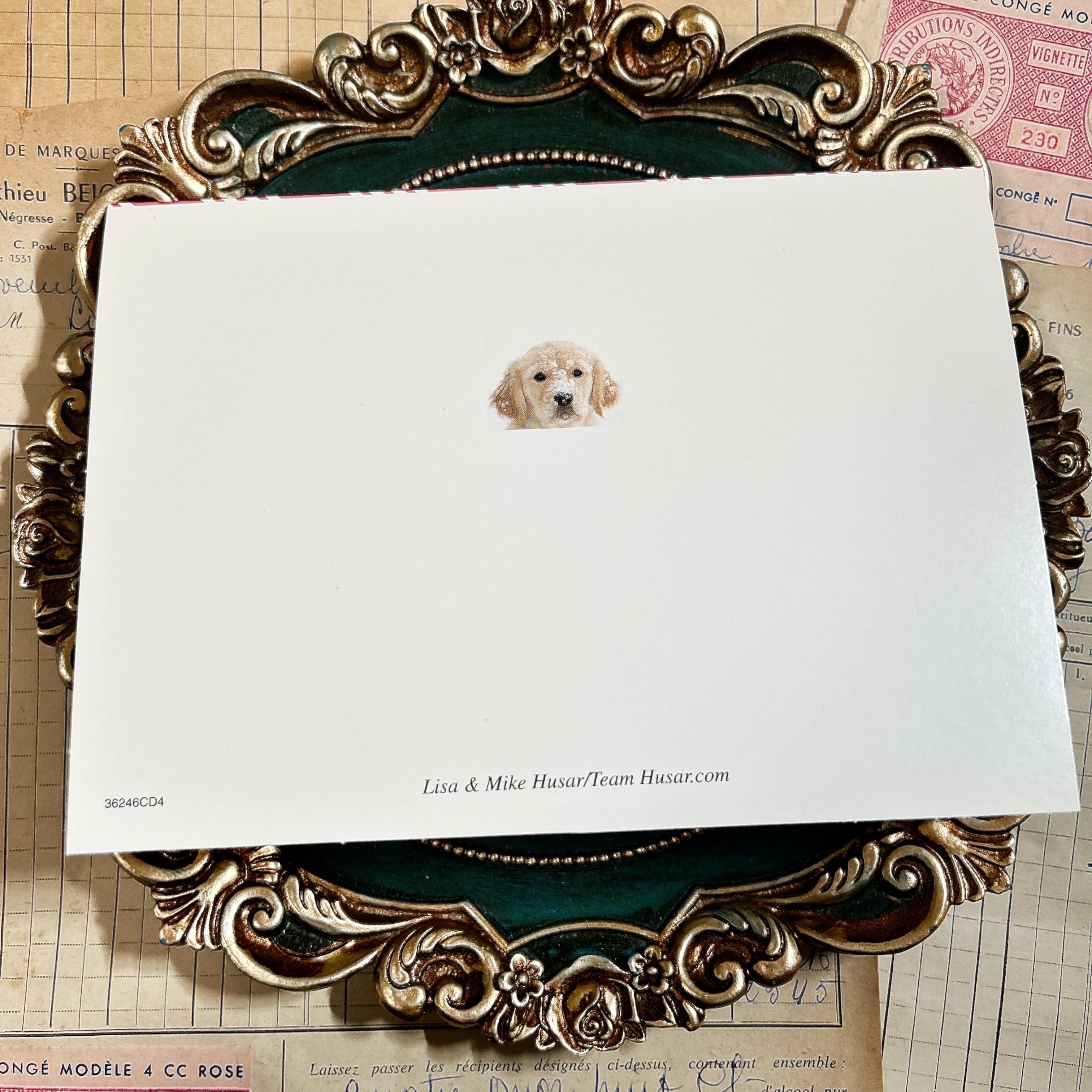 裏面には、表紙の子犬の顔が小さく描かれており、デザイン全体に統一感があります。下部には「Lisa & Mike Husar / TeamHusar.com」とクレジットが入り、フォトカードらしい上質な仕上がりとなっています。