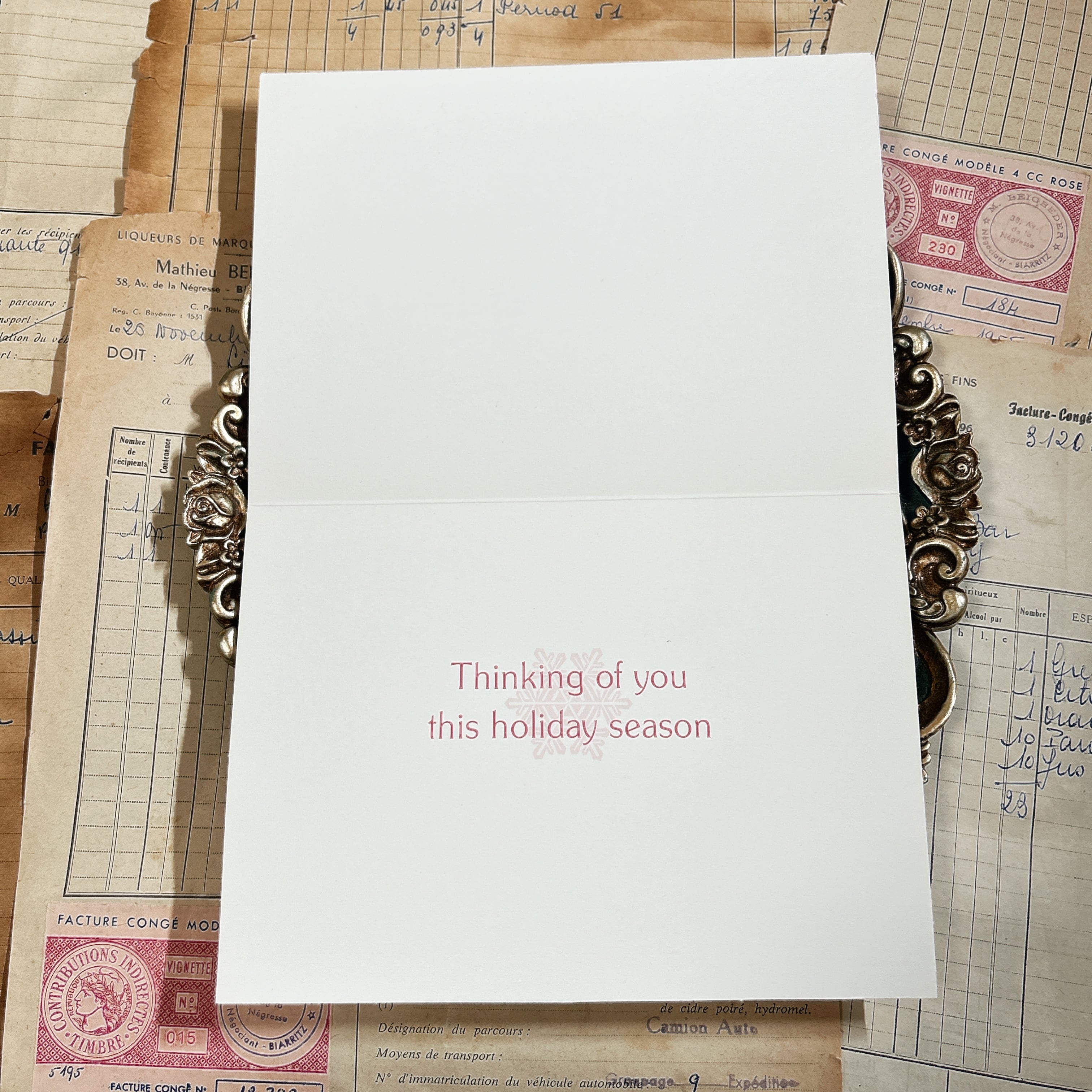 カードを開くと、中央に淡いピンクの文字で「Thinking of you this holiday season」とメッセージが印刷されており、控えめながらも温かい気持ちを伝えられる仕様になっています。余白も広く設けられているため、自由に手書きのメッセージを添えることも可能です。