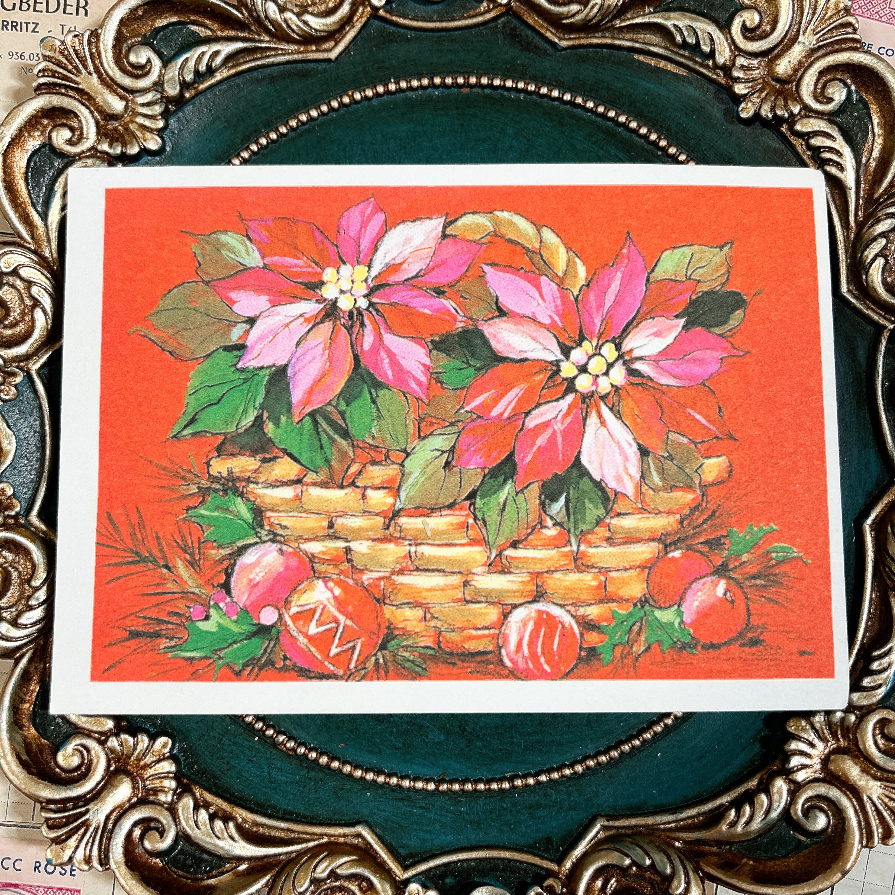 鮮やかな赤を背景に、ポインセチアがふんわりと籠に収められた、温かく華やかなクリスマスデザインのカードです。表面いっぱいに描かれた二輪のポインセチアは、赤・ピンク・白が重なり合う柔らかなタッチで表現され、周囲には濃淡のあるグリーンの葉が美しく広がっています。籠の質感も丁寧に描かれており、編み込みの陰影がカード全体にぬくもりを与えています。足元には赤やピンクのオーナメント、ヒイラギや松の小枝が添えられ、まさにクリスマスらしい華やかさと季節感を詰め込んだ一枚です。