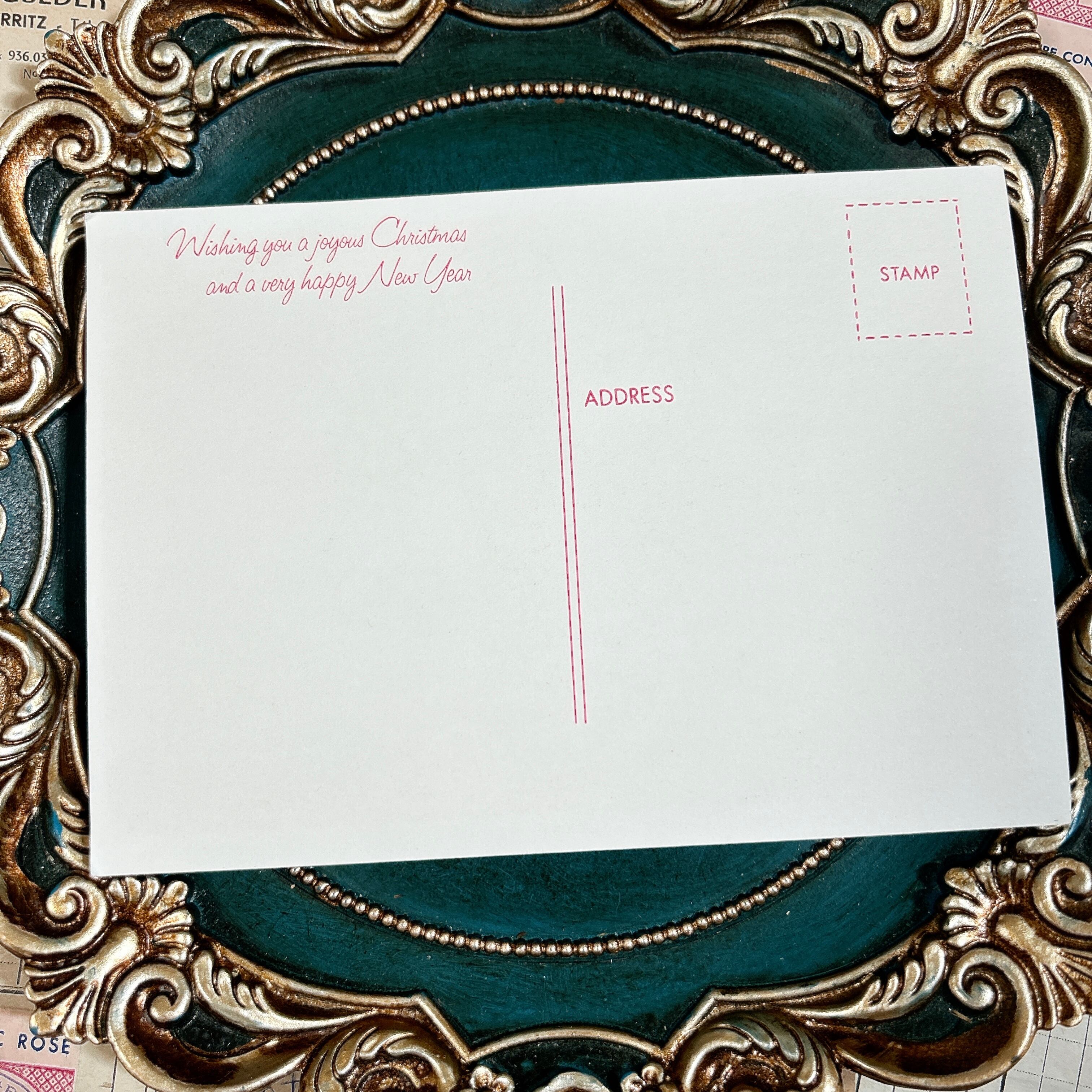 裏面はポストカード仕様になっており、左上には「Wishing you a joyous Christmas and a very happy New Year」というクリスマスと新年の挨拶が優しい筆記体で印刷されています。赤いインクで統一されているため、表面のデザインとの調和が取れ、全体として洗練された印象を持つ仕上がりになっています。右側にはアドレス欄と切手位置が示されており、実際に郵送することも、贈り物に添えるメッセージカードとして使用することも可能です。
