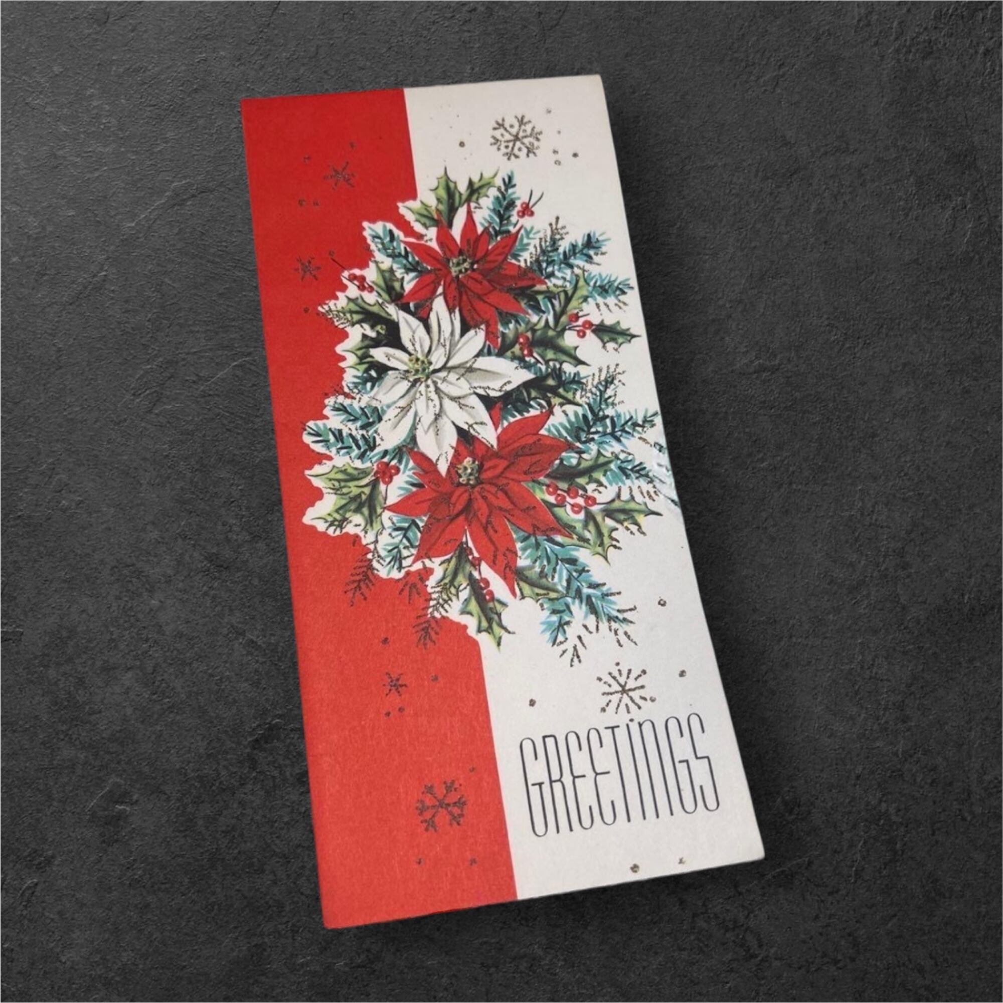 こちらは、赤と白を基調としたポインセチアのブーケが大きく描かれた、アメリカ製のヴィンテージクリスマスカードです。表面には赤いポインセチアと白いポインセチア、ヒイラギや針葉樹の小枝が重なり合うように描かれており、鮮やかな赤と落ち着いた白のコントラストが美しく、クラシックなホリデームードを感じさせます。背景は左右で赤と白に分かれていて、中央の花束を一層引き立てるデザインになっています。右下には細い縦長のフォントで「GREETINGS」と印字され、シンプルながらも洗練された印象です。