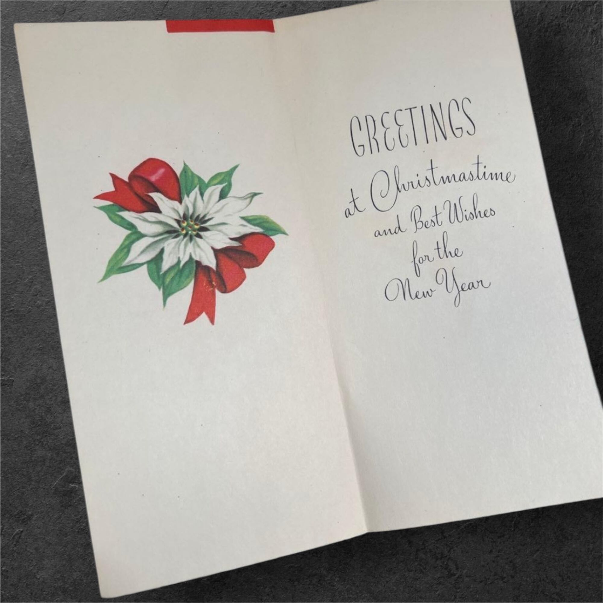 カードを開くと、左側に赤いリボンをまとった白いポインセチアの小さなイラストが配置されています。右側には英字のメッセージが印刷されており、「GREETINGS at Christmastime and Best Wishes for the New Year」と、クリスマスと新年への温かな祝福の言葉が添えられています。文字は手書き風の優しい書体で、ノスタルジックな雰囲気を高めています。内側には書き込み跡はなく、未使用の状態です。