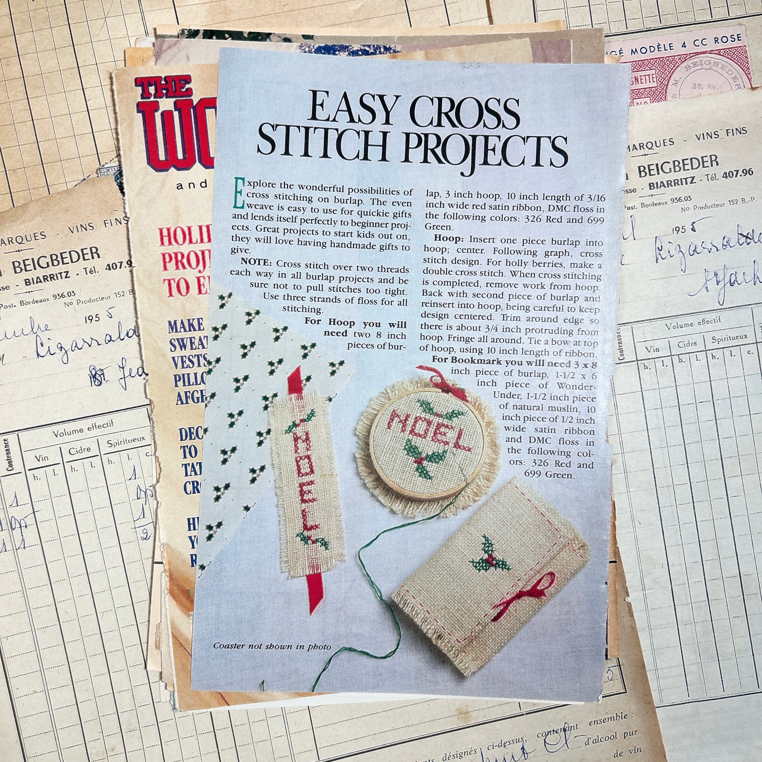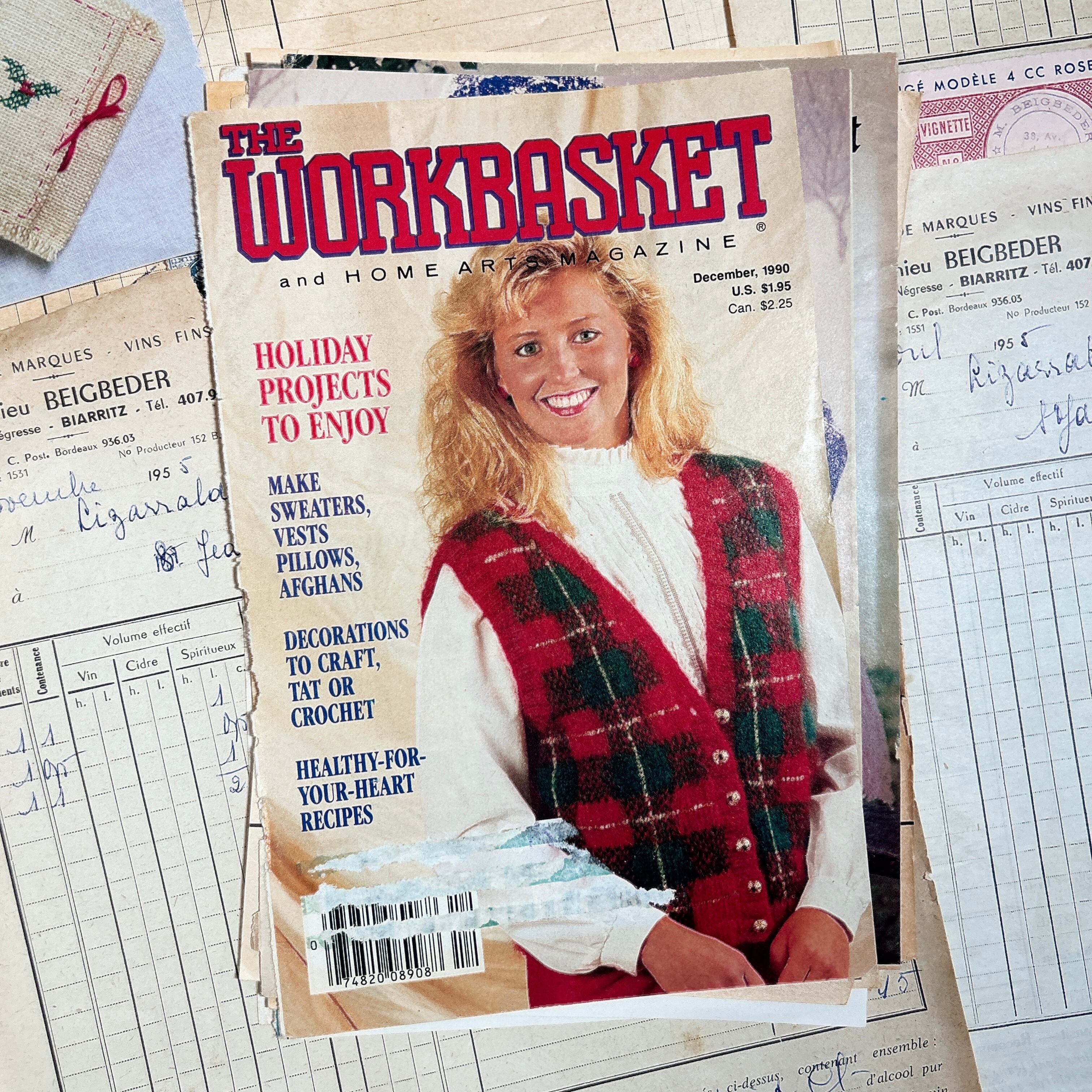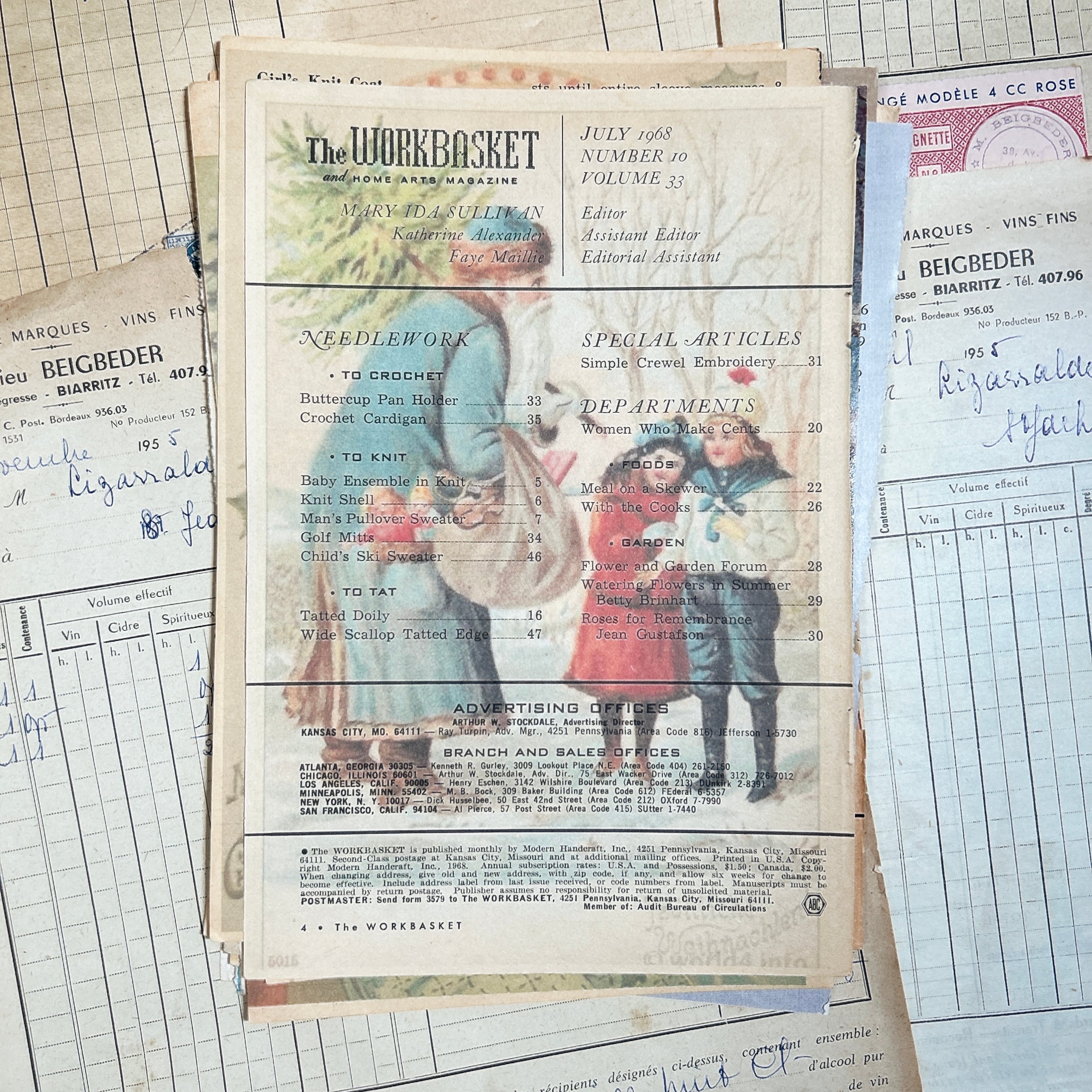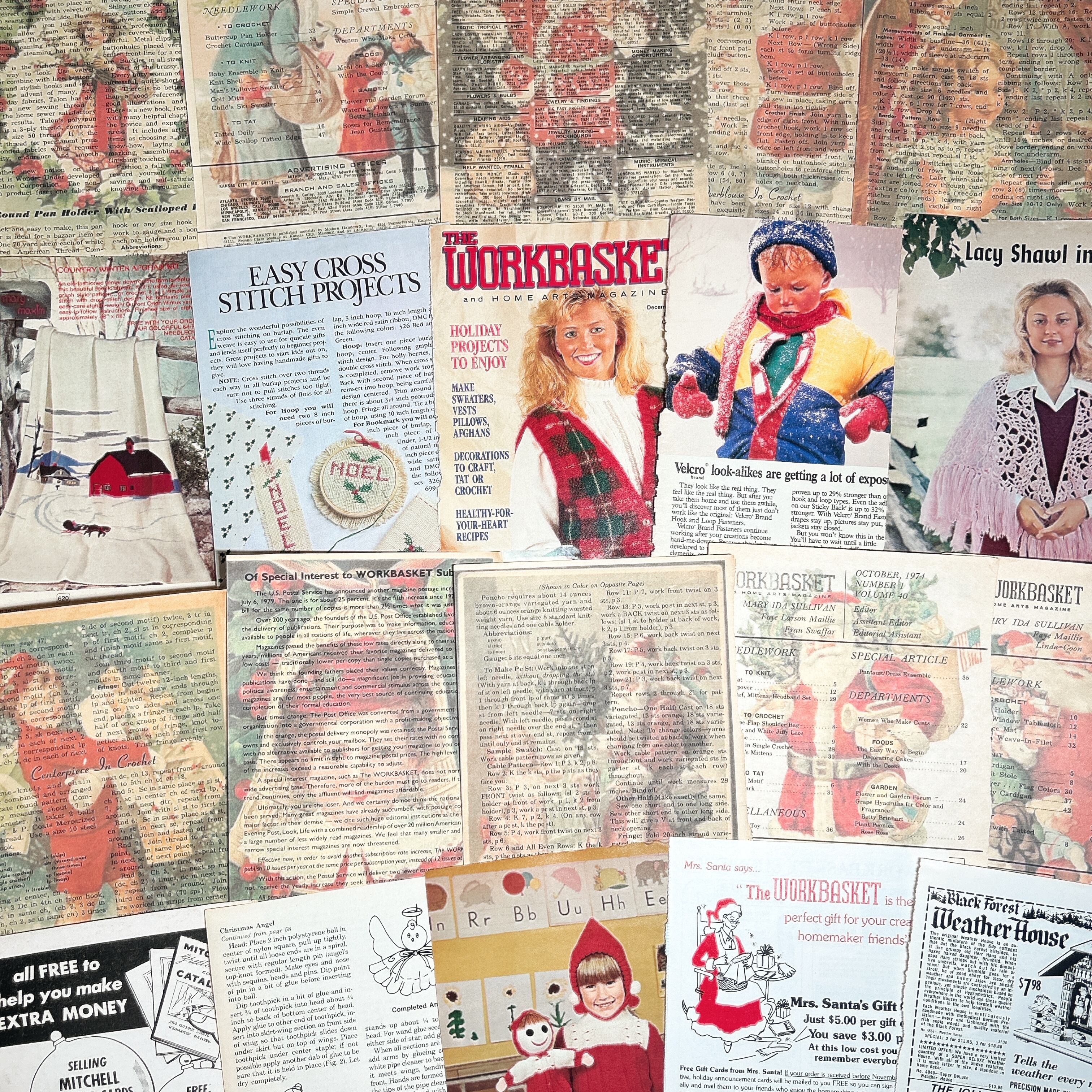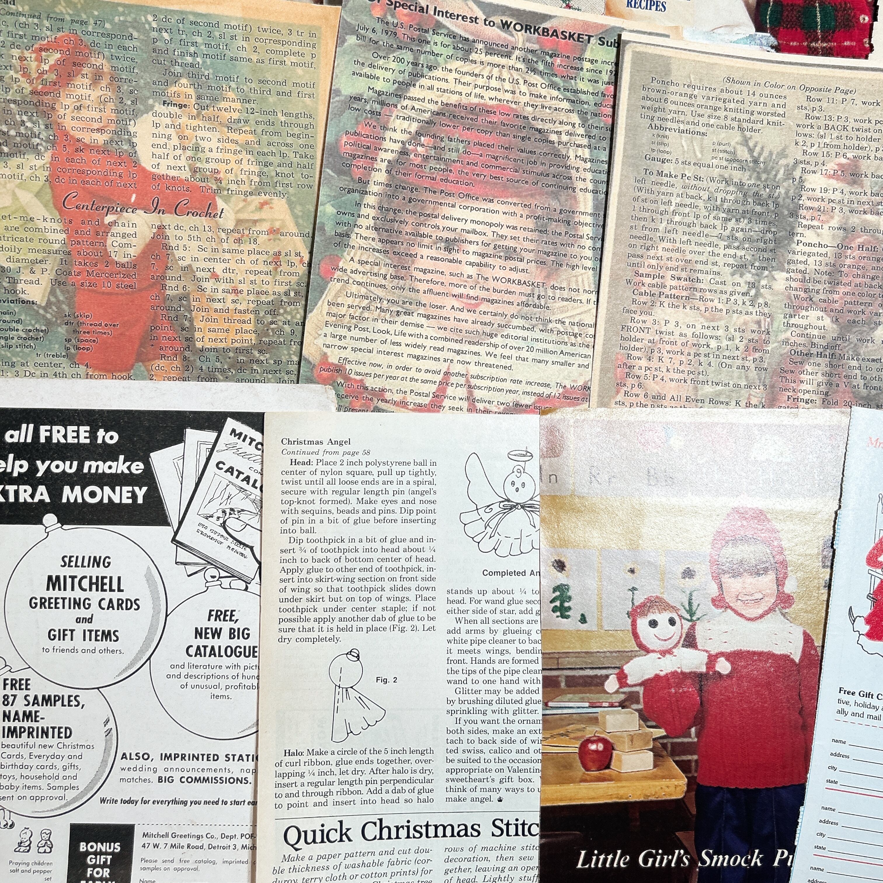 1950〜80年代にアメリカで発行された雑誌『The Workbasket』や家庭用ハンドクラフト誌から切り出した、本物のヴィンテージペーパー20枚セットです。ニットやクロシェ、刺繍、料理、手芸など家庭のぬくもりをテーマにしたページが多く、温かく優しい紙面デザインが魅力です。誌面の多くは当時の印刷技法そのままのざらりとした紙質で、経年による焼けやインクのかすれも味わいとして残っています。広告ページには当時のミシン、糸、家庭用品などが並び、アメリカの主婦たちがどんな暮らしをしていたのかを感じさせてくれます。