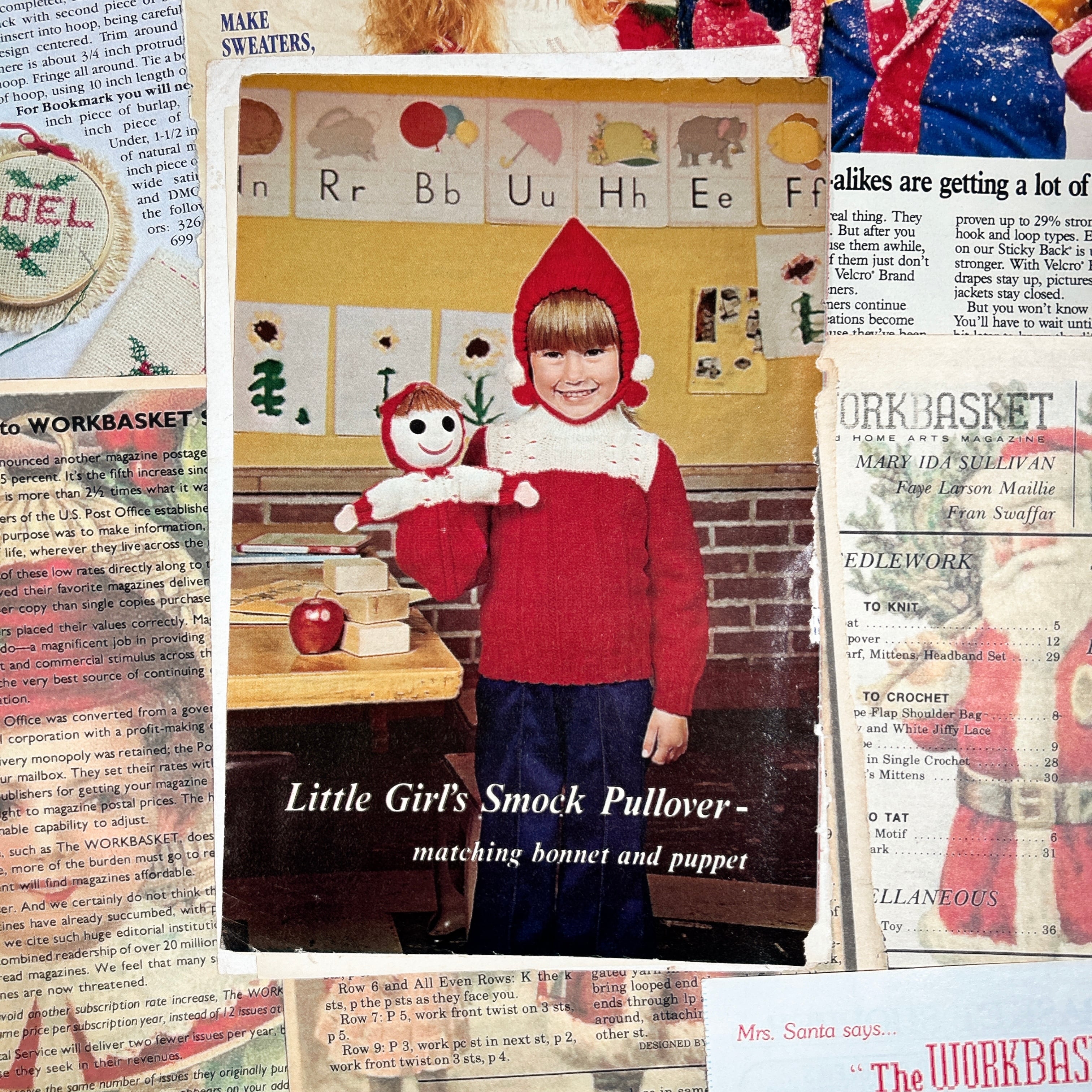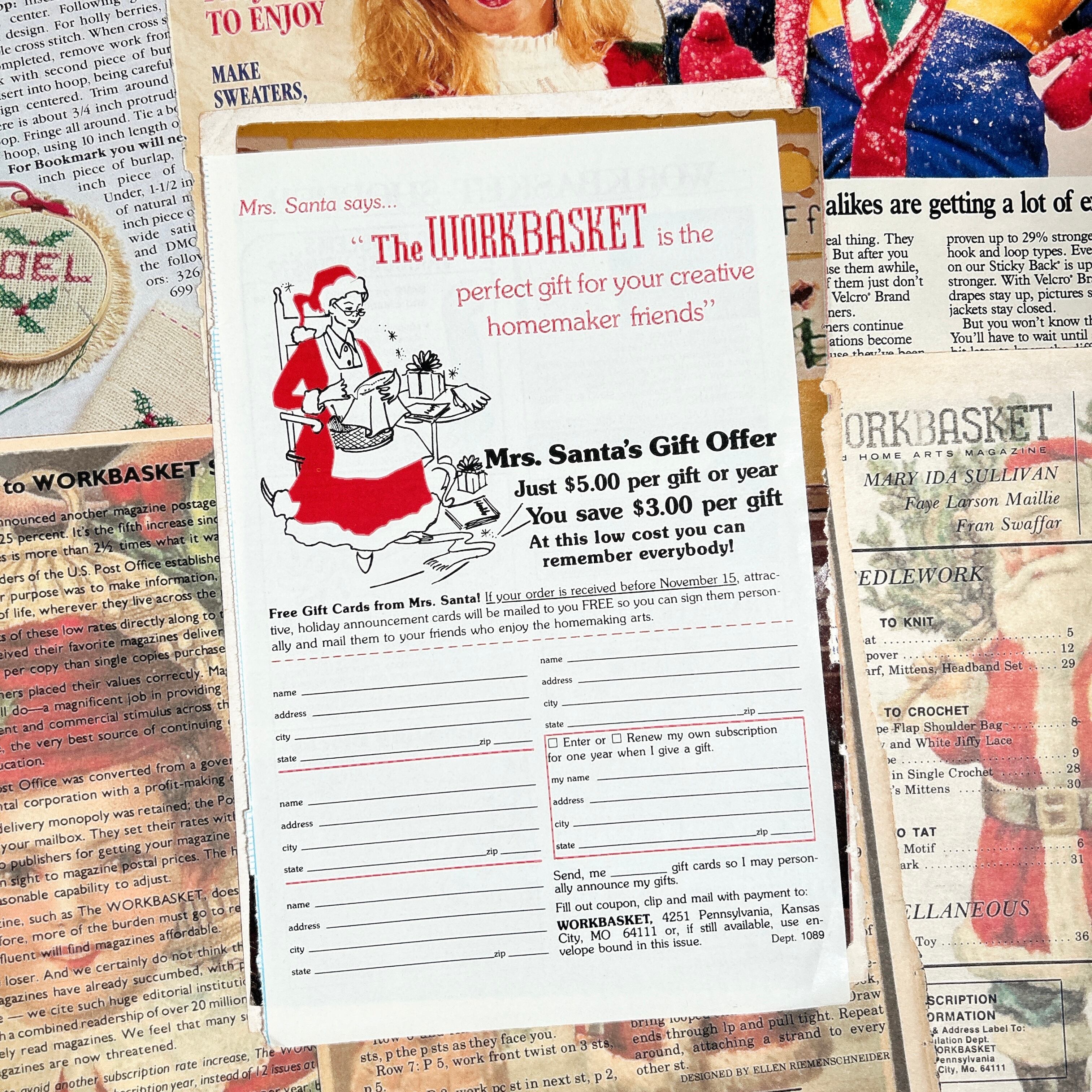 セットの中には、クリスマス号の特集やホリデーシーズン向けの編み図、手作りオーナメント、子どもたちの冬のファッションページなど、季節感を楽しめるページも含まれています。プレゼントレートやサンタのイラストが描かれたギフトページ、色鮮やかなケーキやお菓子の写真など、当時の華やかなホリデー文化を伝える一枚も。