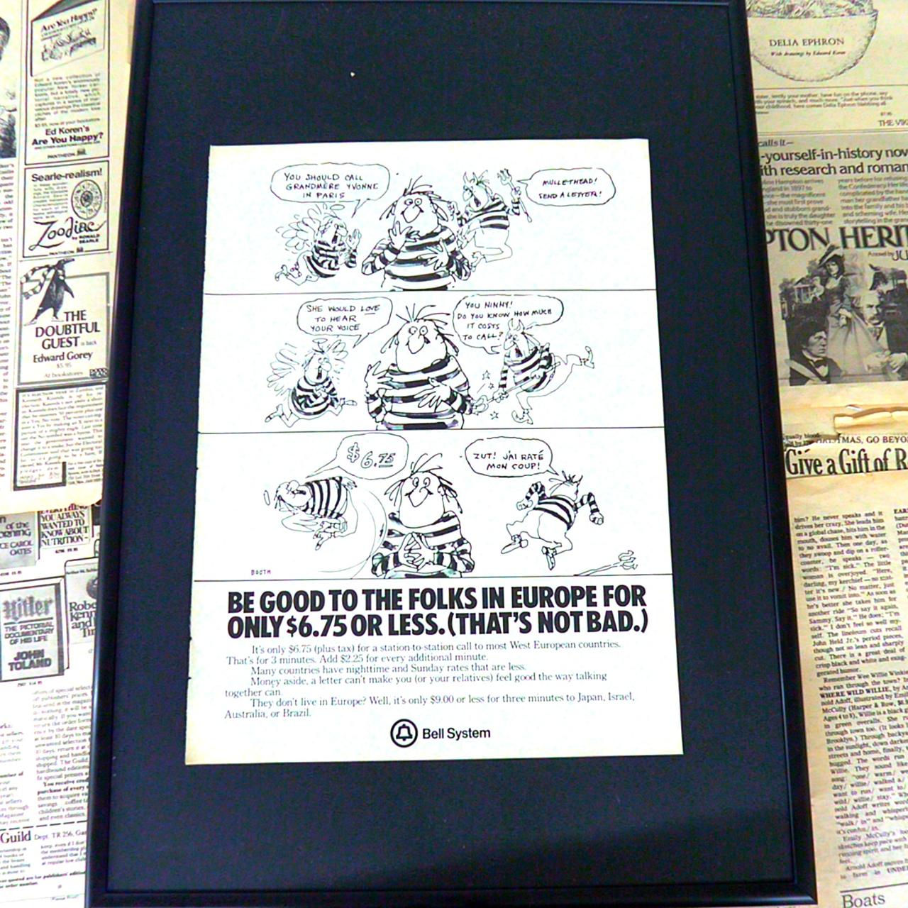 Bell System(ベル・システム)は、かつてアメリカを中心に長距離電話サービスを展開していた通信会社で、電話の発明者アレクサンダー・グラハム・ベルにちなんで名付けられました。19世紀後半から20世紀にかけて、米国の電話インフラを構築し、一般家庭から企業、政府機関まで幅広い顧客に電話サービスを提供していました。特に国際電話や長距離通話の分野で先駆的な技術とサービスを提供し、人々のコミュニケーションを支えました。この広告は、当時高価だった西ヨーロッパへの国際電話が安価に利用できることをアピールし、海外との繋がりを身近にしたBell Systemの役割を伝えています。