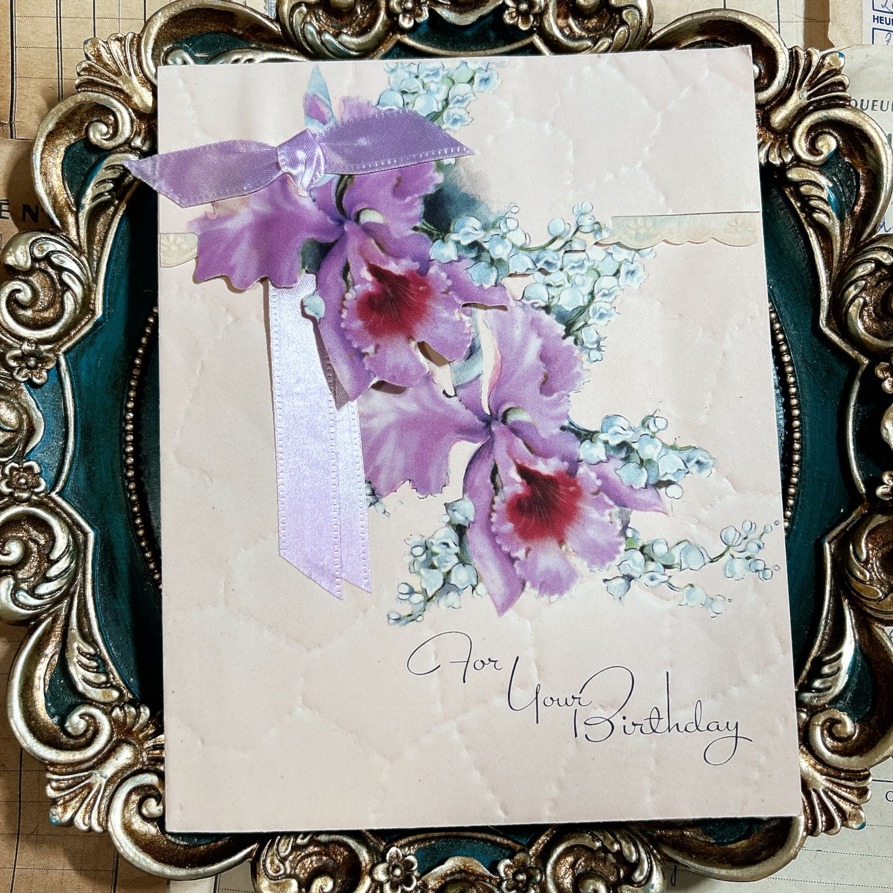 淡いアイボリーの紙地に、紫の蘭の花束が優雅に描かれた、上品な雰囲気のバースデーカードです。花には立体感のある繊細な印刷が施され、花弁のグラデーションや赤みを帯びた中心部まで丁寧に表現されています。左上には淡いラベンダーカラーのサテンリボンがあしらわれ、カード全体に柔らかな華やかさを添えています。背景の紙にはさざ波のようなエンボス加工が見られ、静かな陰影が上質感を引き立てています。表面下部には流れるような筆記体で「For Your Birthday」と記され、落ち着いた大人の贈り物として印象的な一枚です。