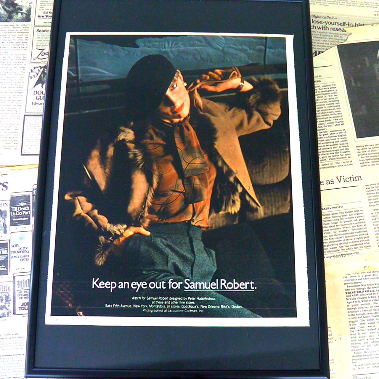 Samuel Robertは、洗練されたファッションを提案するアメリカのブランドです。1970年代を代表するスタイリッシュなデザインと、高品質な素材使いが魅力で、都会的でエレガントな女性像を演出します。本広告では、Peter HatsiAndrouによるデザインが紹介されており、ニューヨークやニューオーリンズ、デイトンなど全米の有名デパートで展開されていました。Samuel Robertは、時代を超えて愛されるモダンで個性的なスタイルを発信し続けています。