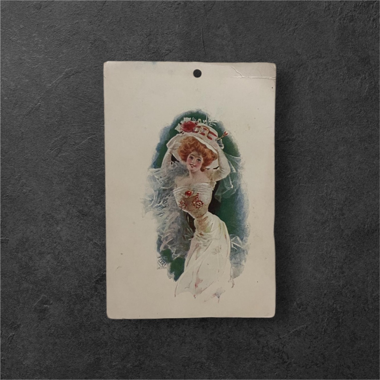 縦長のフォーマットに、華やかな女性像が描かれたヴィンテージカードです。淡い生成り色の台紙の中央に、ドレスをまとった女性が優雅なポーズで立つ姿が配されており、透けるような布の表現や柔らかな色使いから、19世紀末から20世紀初頭のロマンティックな雰囲気が感じられます。赤みのある髪と繊細な表情、装飾的な帽子や胸元の花のモチーフが、当時の美意識をそのまま写し取ったような印象的な一枚です。