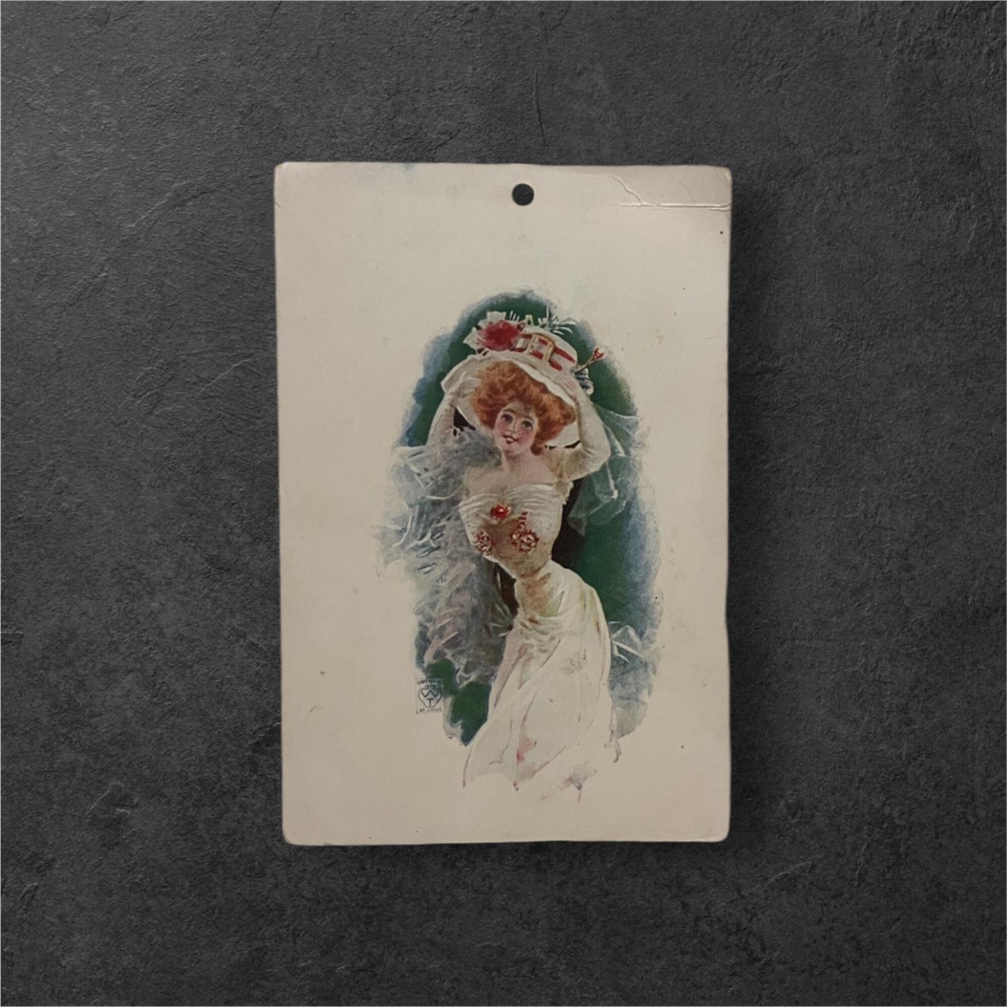 背景は淡いグリーンとブルーが溶け合うように描かれ、人物を包み込むような構図になっています。印刷は細やかで、ドレスの質感やレースの表現にも奥行きがあります。上部には小さな穴が開いており、当時は吊るして飾られていた可能性も感じさせます。