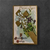 金色の縁取りが施されたカードに、復活を象徴する十字架と花々が描かれたイースター向けのポストカードです。やわらかな水色の背景に、白や紫の花が絡むように配置され、立体感のある金彩の十字架が静かに存在感を放っています。上部には「Christ is Risen」、下部には「A Joyful Easter Greeting」と記され、宗教的な意味合いと祝福の気持ちが丁寧に表現された一枚です。全体として落ち着きと華やかさを併せ持つデザインで、信仰行事としてのイースターを大切にしていた時代の空気が感じられます。