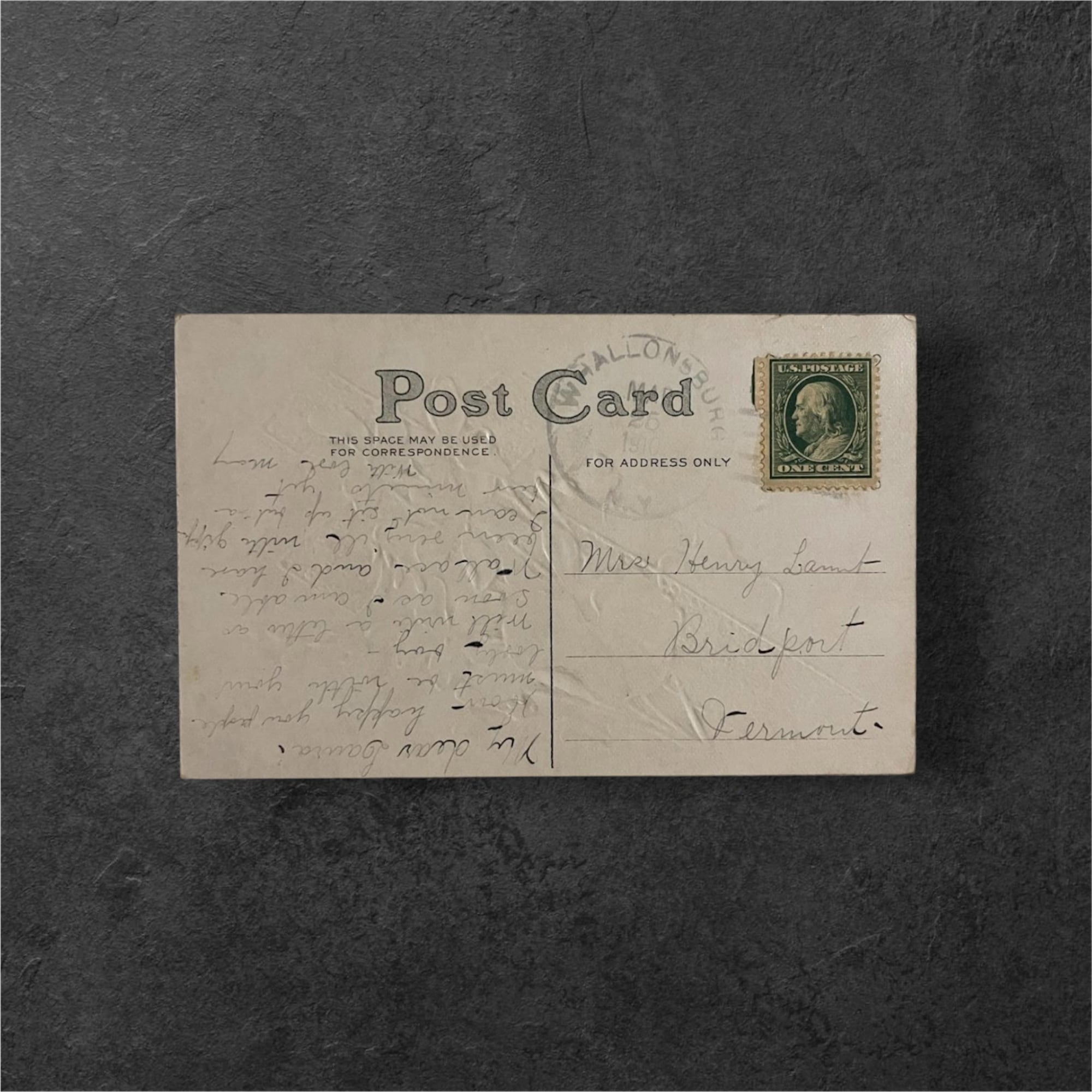 裏面はPOST CARD表記の分割タイプで、実際に郵送された形跡があり、1セント切手が貼付されています。手書きのメッセージや消印が残っており、当時のやりとりや個人の時間を想像させる点も魅力です。紙面には経年による黄ばみやシワ、薄い汚れが見られますが、それらも含めてアンティークならではの風合いとしてお楽しみいただけます。宗教画モチーフやイースターカードをお探しの方、紙ものや海外の古い郵便文化に惹かれる方におすすめの一点です。