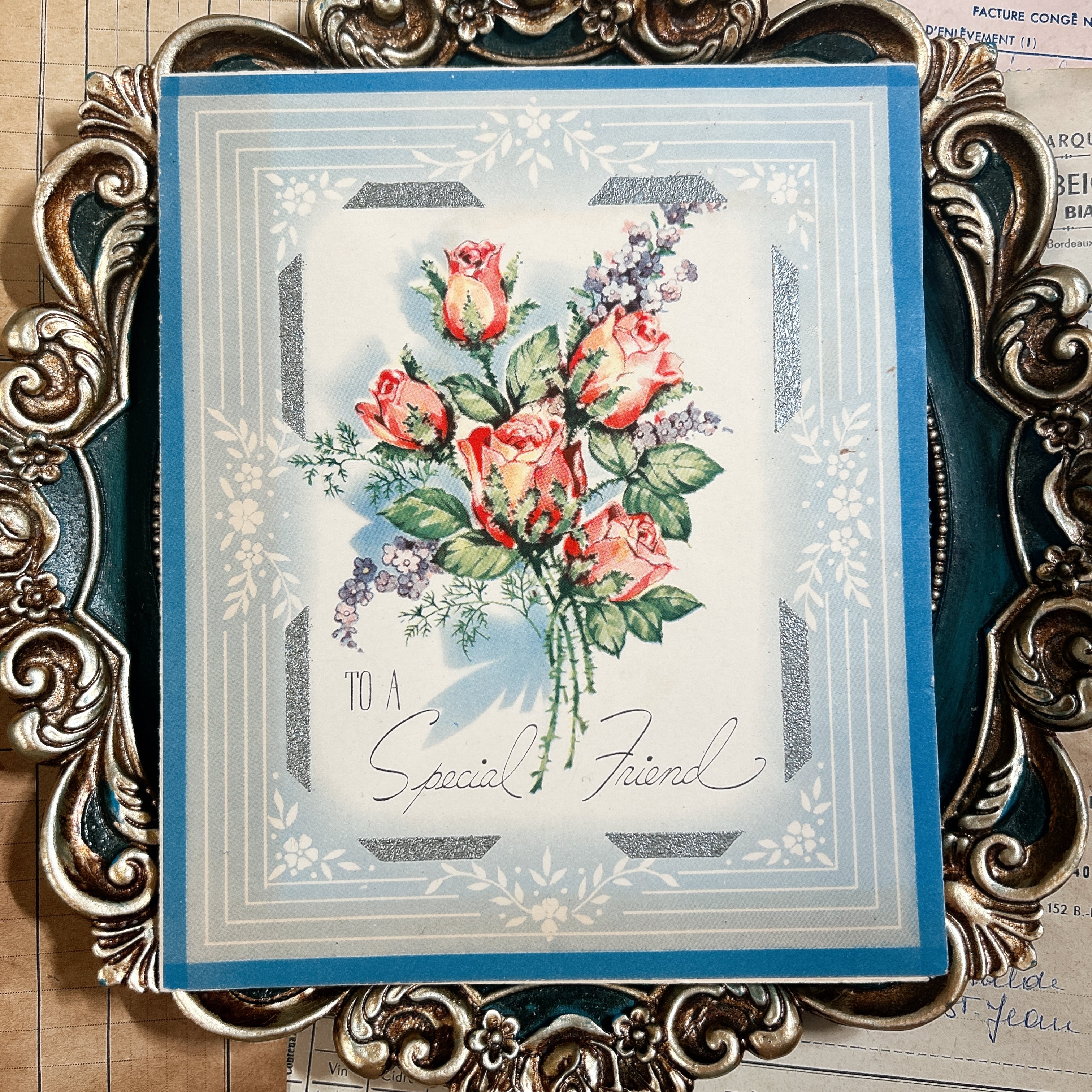 淡いブルーの縁取りに、やさしい色合いの花束が描かれたヴィンテージの二つ折りグリーティングカードです。中央にはピンクのバラを主役に、小花やグリーンを束ねたクラシカルなブーケが配され、「To a Special Friend」の文字が添えられています。全体に柔らかな色調でまとめられており、上品で静かな華やかさを感じさせるデザインです。印刷のかすれや色のにじみも味わいとして残り、当時の空気感が伝わってきます。