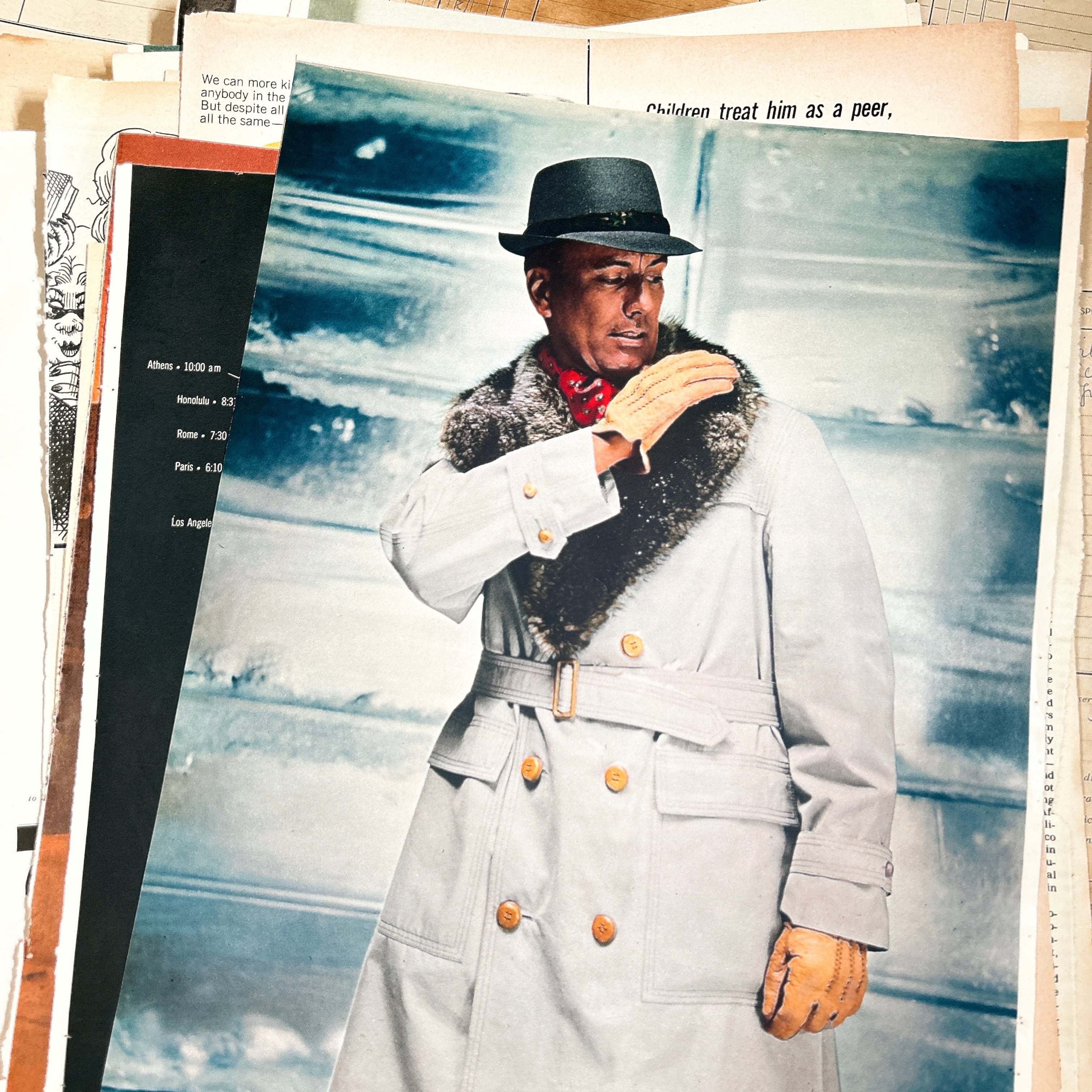 アメリカのヴィンテージ雑誌から切り離されたページを、ランダムに30ページまとめたセットです。風景写真、人物ポートレート、アートやファッション広告、カルチャー記事など、当時の空気感がそのまま残る多彩なビジュアルが楽しめます。紙面ごとに色味やレイアウト、フォントの表情が異なり、眺めているだけでも資料性の高い内容です。