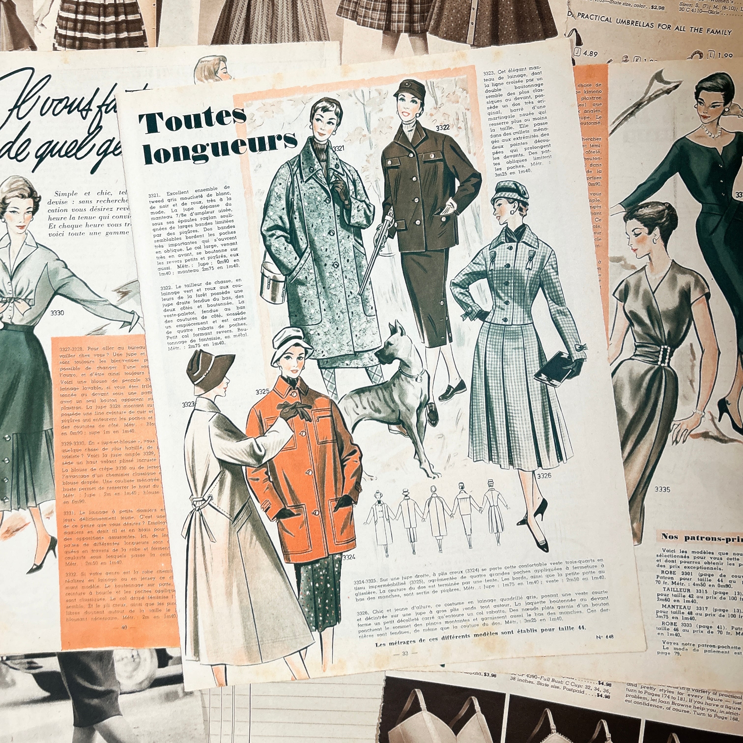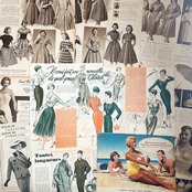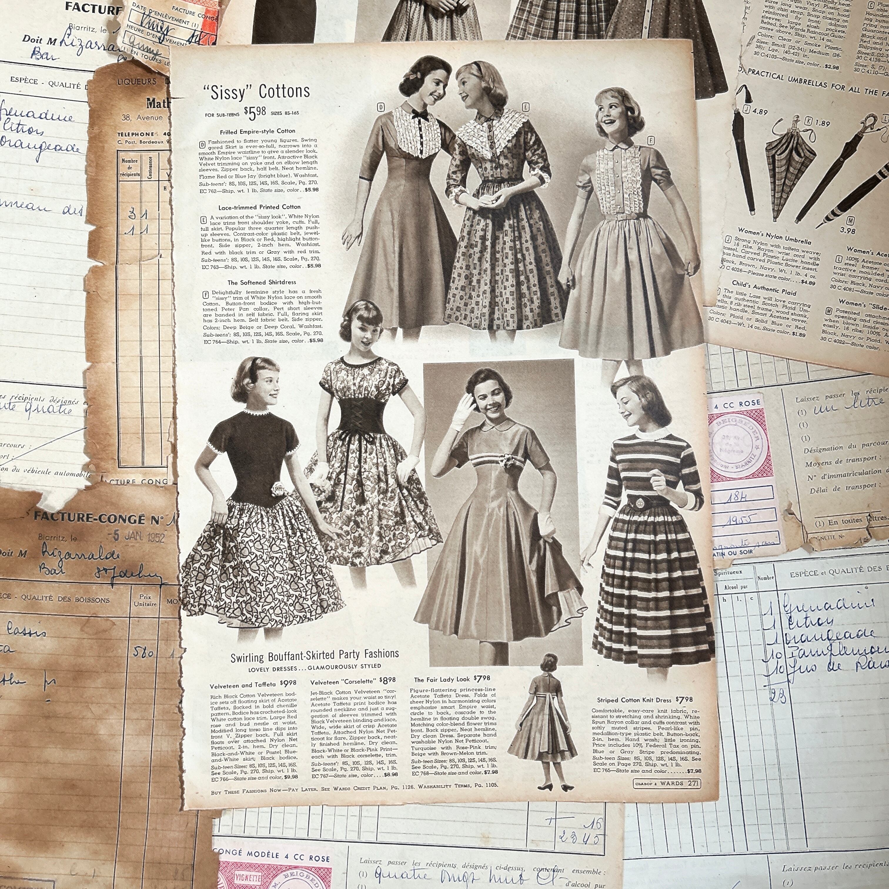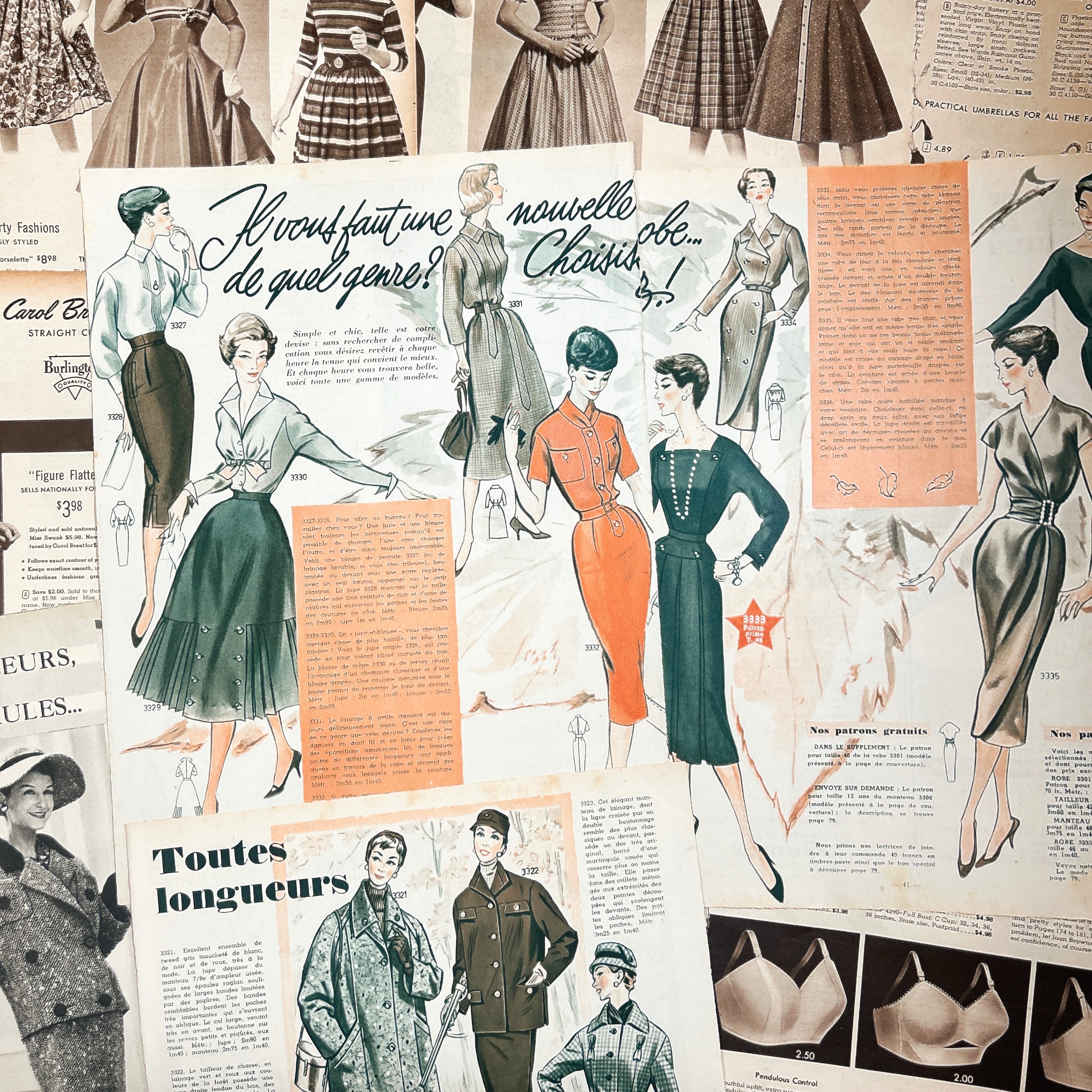 アメリカとフランスのヴィンテージファッション雑誌から切り離されたページを集めた、全10枚のセットです。いずれも1950年代前後と思われる誌面で、当時の空気感を色濃く残した貴重な紙ものになります。