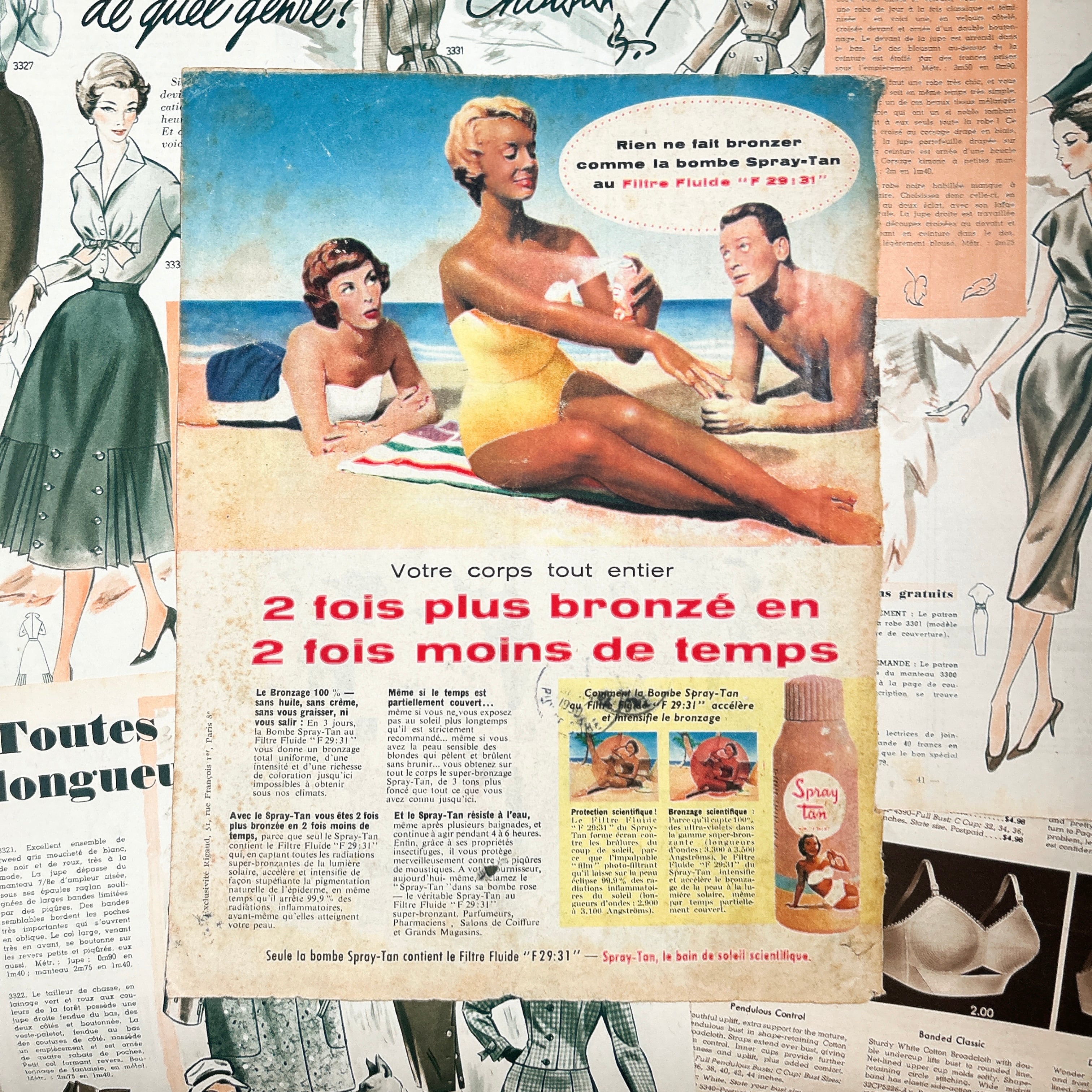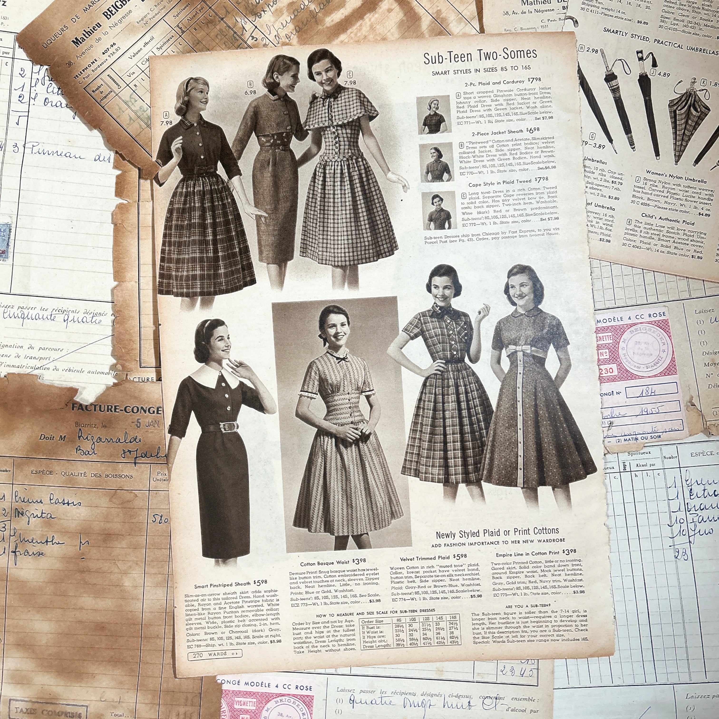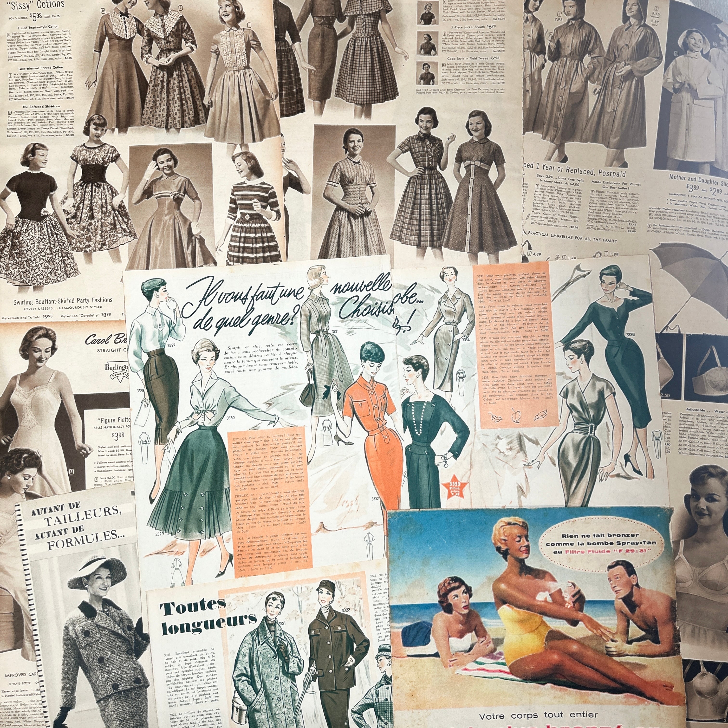 アメリカとフランスのヴィンテージファッション雑誌から切り離されたページを集めた、全10枚のセットです。いずれも1950年代前後と思われる誌面で、当時の空気感を色濃く残した貴重な紙ものになります。