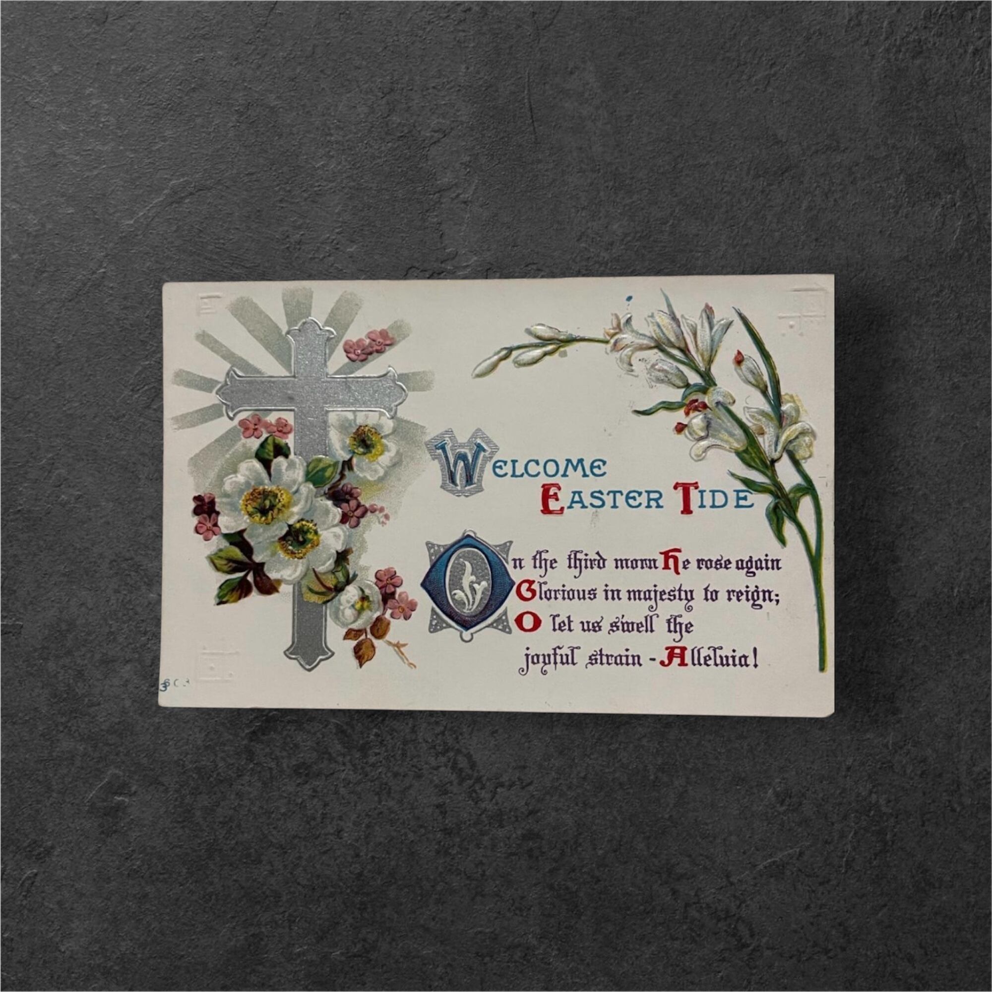 「Welcome Easter Tide」の文字とともに、キリストの復活を讃える詩が彩り豊かな装飾文字で綴られており、当時ならではの優美なタイポグラフィが魅力です。淡い色彩とエンボス加工による立体感が相まって、静かな気品を感じさせる一枚となっています。