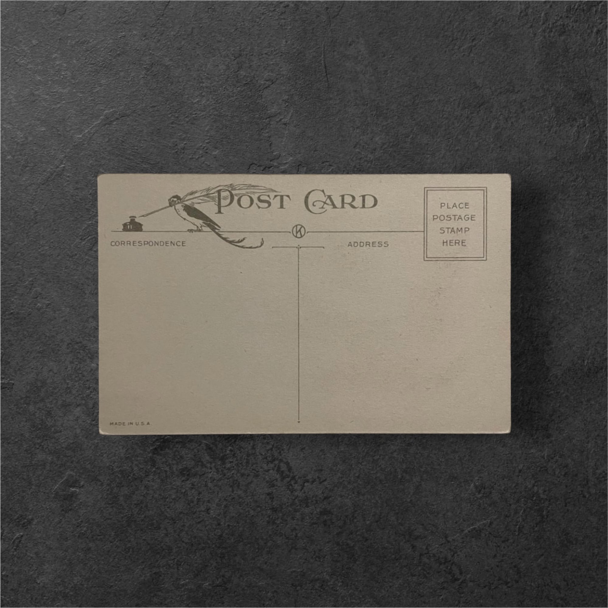 裏面は未使用で、「POST CARD」のタイトルとともに、宛名面と通信面が仕切られたクラシックなレイアウトです。切手を貼るための枠や、飛ぶ鳥のイラストがデザインされ、「MADE IN U.S.A.」の表記も確認できます。