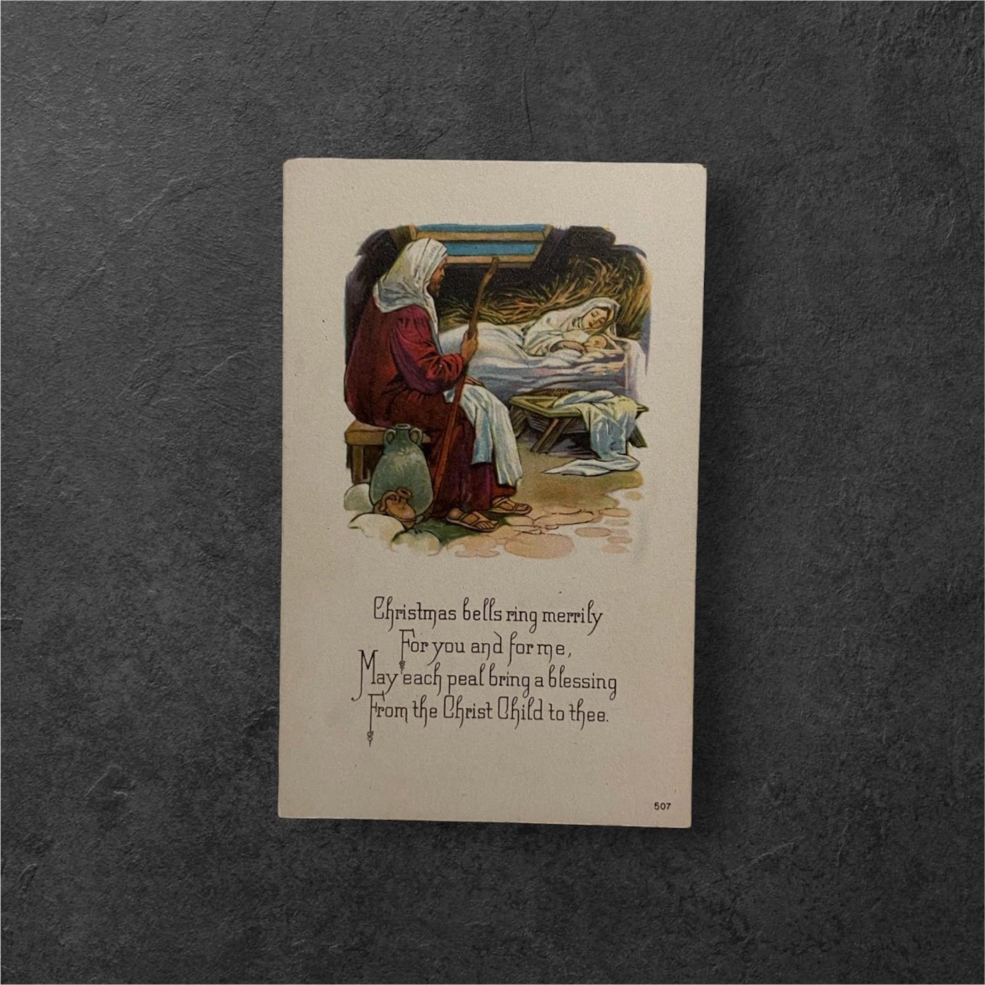 カード下部には「Christmas bells ring merrily / For you and for me, / May each peal bring a blessing / From the Christ Child to thee.」という詩が美しい装飾書体で印刷されており、クリスマスの祝福を願うメッセージが添えられています。右下には番号「507」の記載があります。