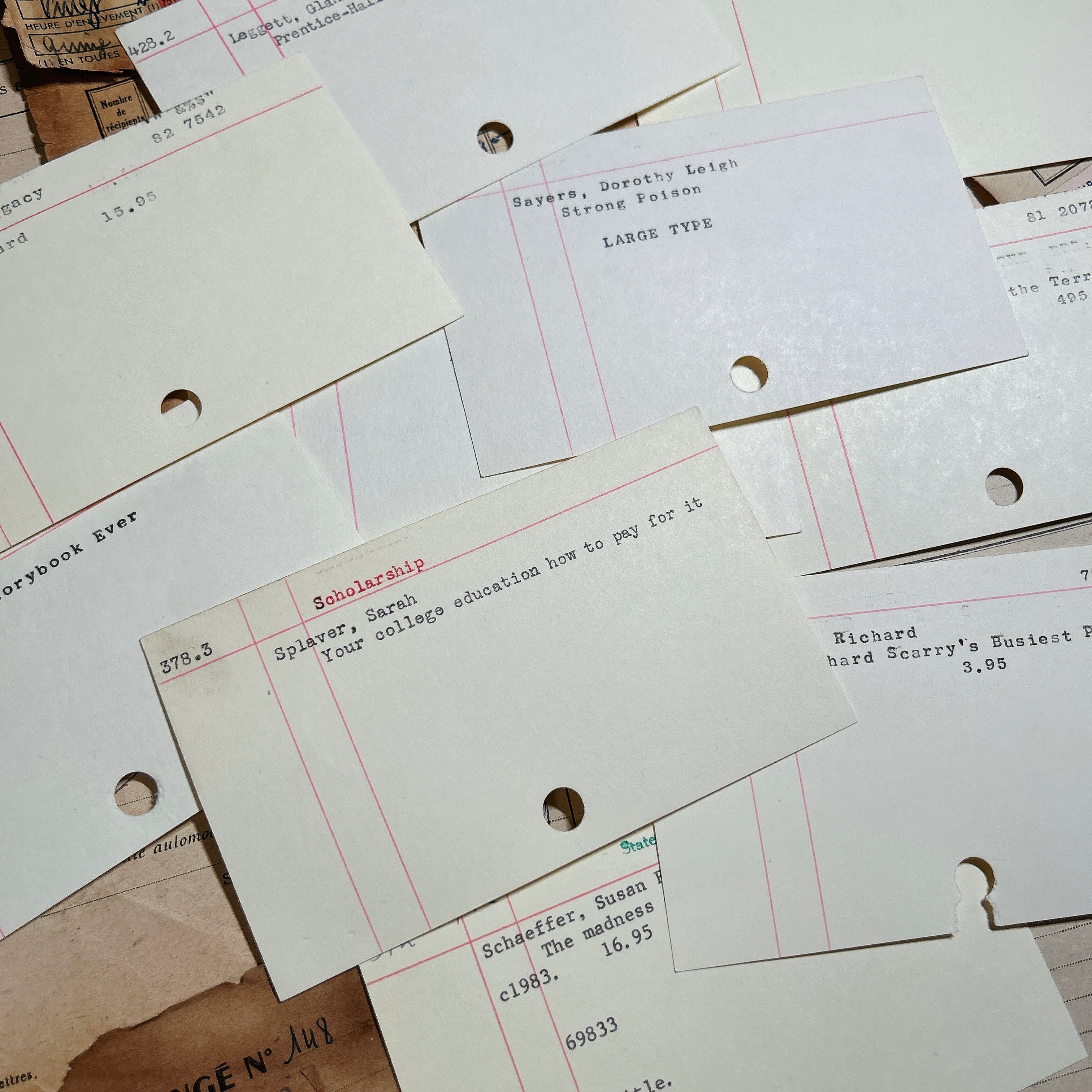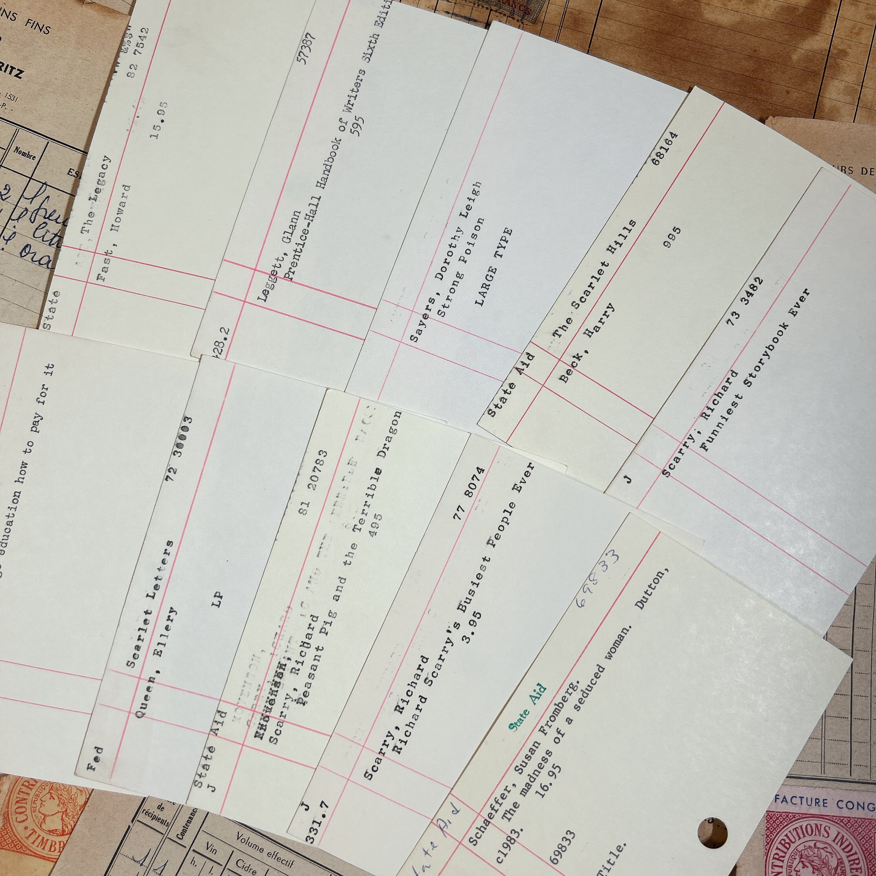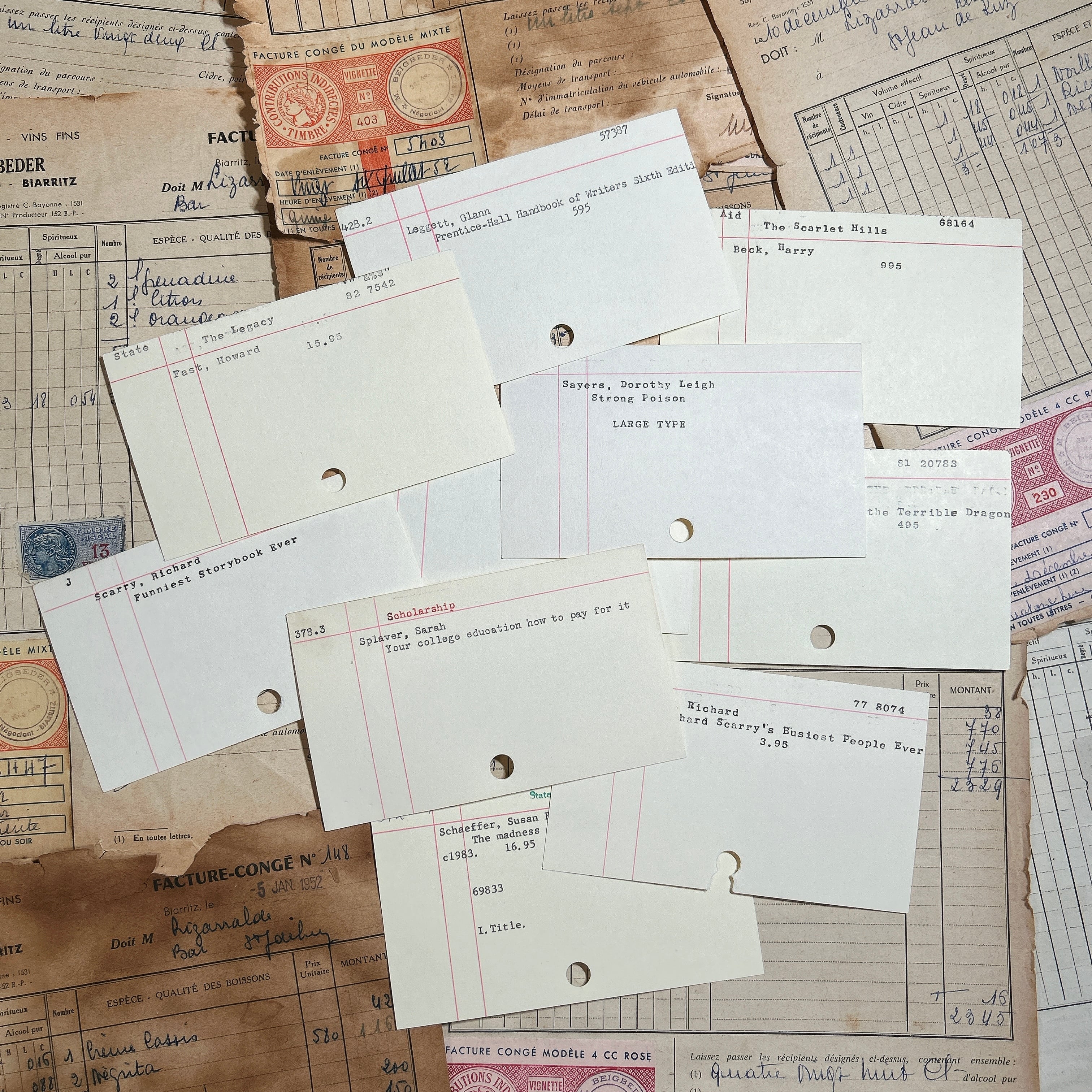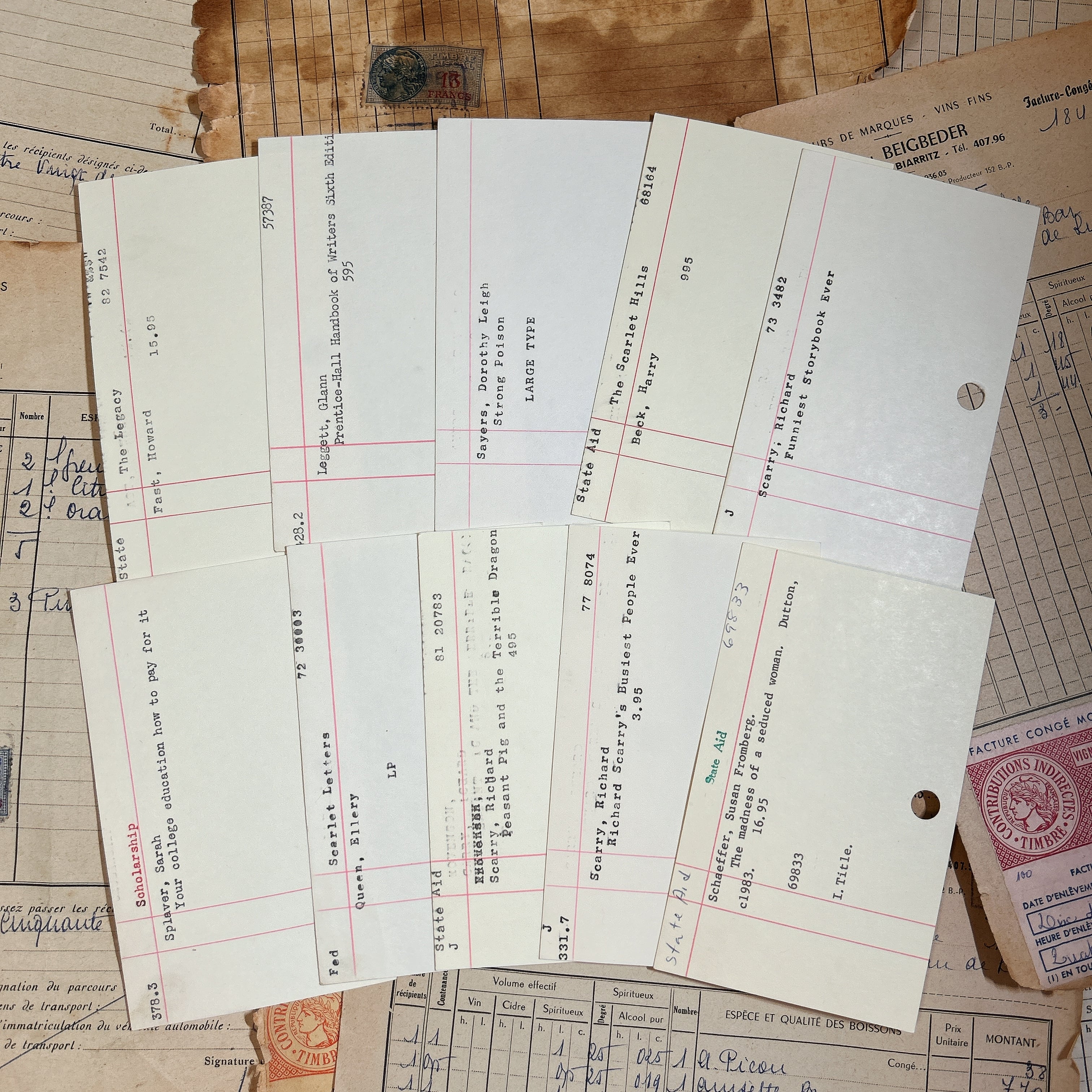 海外の図書館で実際に使用されていた雰囲気を感じられる、ブランクのライブラリーカード10枚セットです。アイボリー寄りのやわらかな紙色に、すっと伸びる赤い罫線が印象的で、シンプルながらもクラシカルな佇まいを楽しめます。活字で打たれた書籍名や著者名が入ったカードもあれば、ほぼ無地に近いものもあり、内容はランダムとなります。