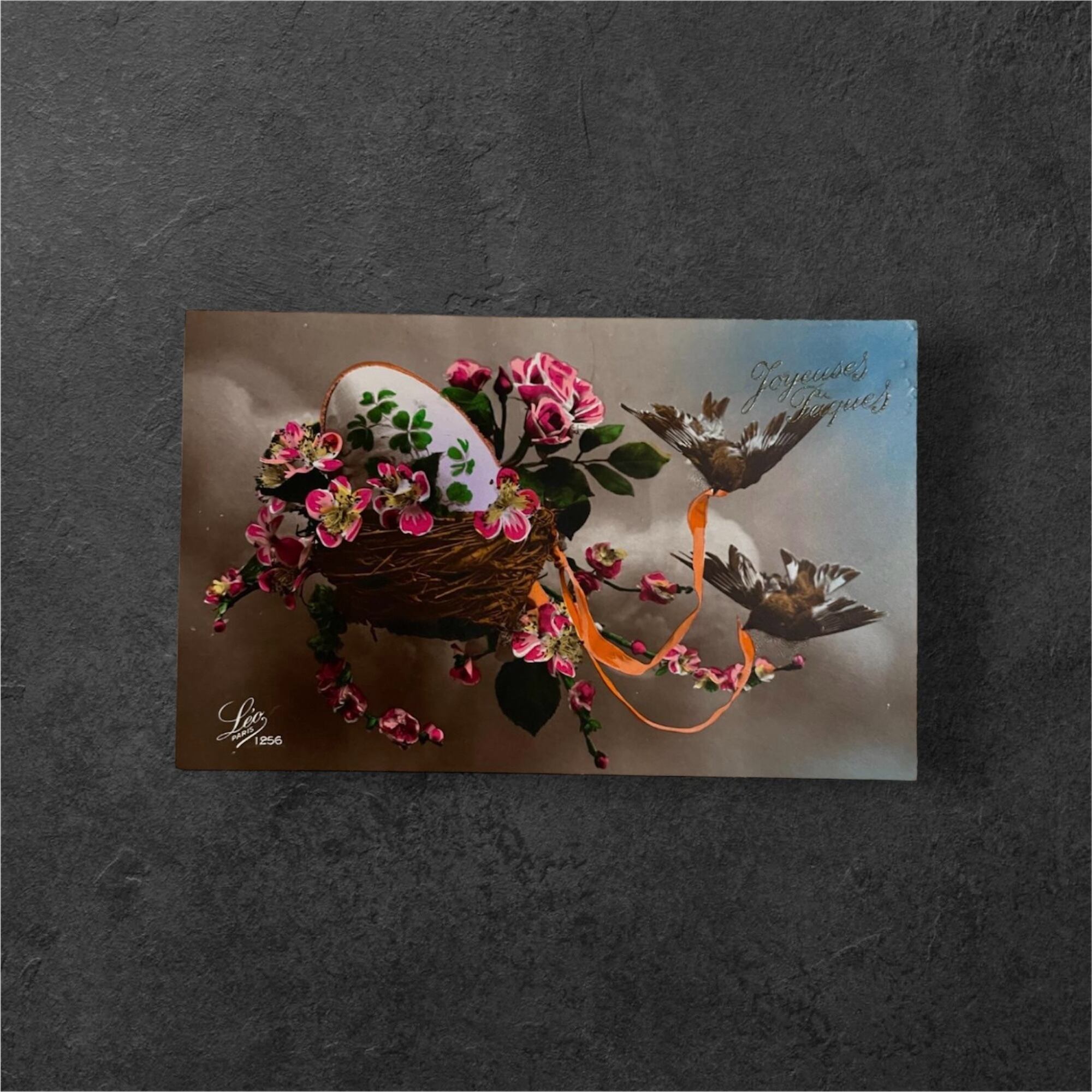 フランスのアンティークポストカードです。表面には花で飾られた鳥の巣と、クローバー模様が描かれた卵、そしてピンク色の花々が立体的に配置された華やかな構図が広がります。オレンジ色のリボンが優雅に流れ、その先には羽ばたく二羽の鳥が描かれています。右上には「Joyeuses Pâques」の文字が入り、復活祭を祝うカードであることがわかります。背景はやわらかなグラデーションで、幻想的で温かみのある雰囲気を醸し出しています。左下には作家名と番号の記載が見られます。