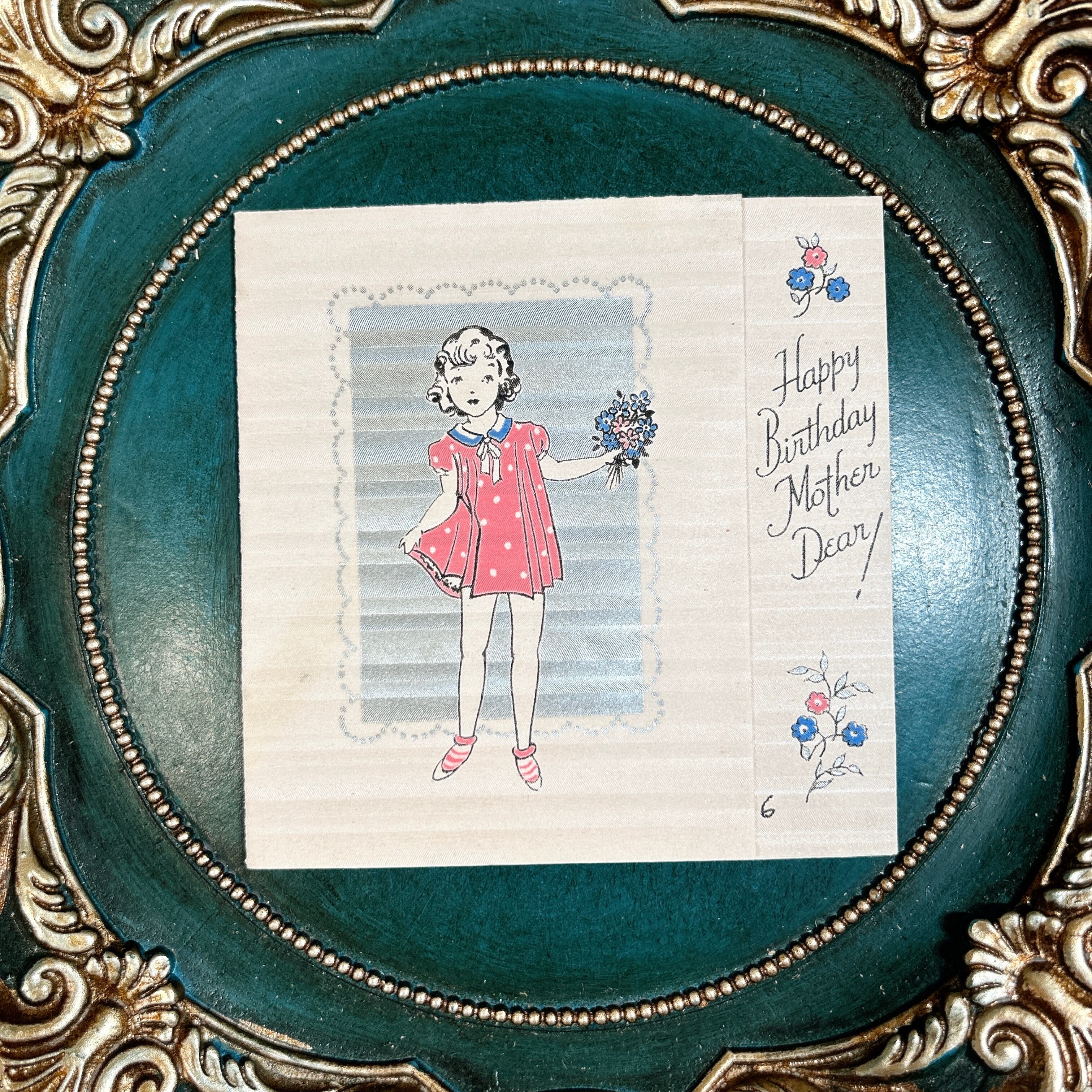 やさしい生成り色の地に、淡いブルーとピンクの小花を散らした、可憐で愛らしいヴィンテージバースデーカードです。表紙には花束を手にした少女のイラストが描かれており、水玉模様のピンクのワンピースや小さな靴の色合いがとても印象的です。右側には「Happy Birthday Mother Dear!」の文字がすっきりと縦に配され、素朴であたたかな雰囲気の中に、母の日やお母さまへの誕生日祝いらしい優しい気持ちが感じられるデザインになっています。背景の細かな横筋模様も上品で、紙そのものにさりげない表情があります。