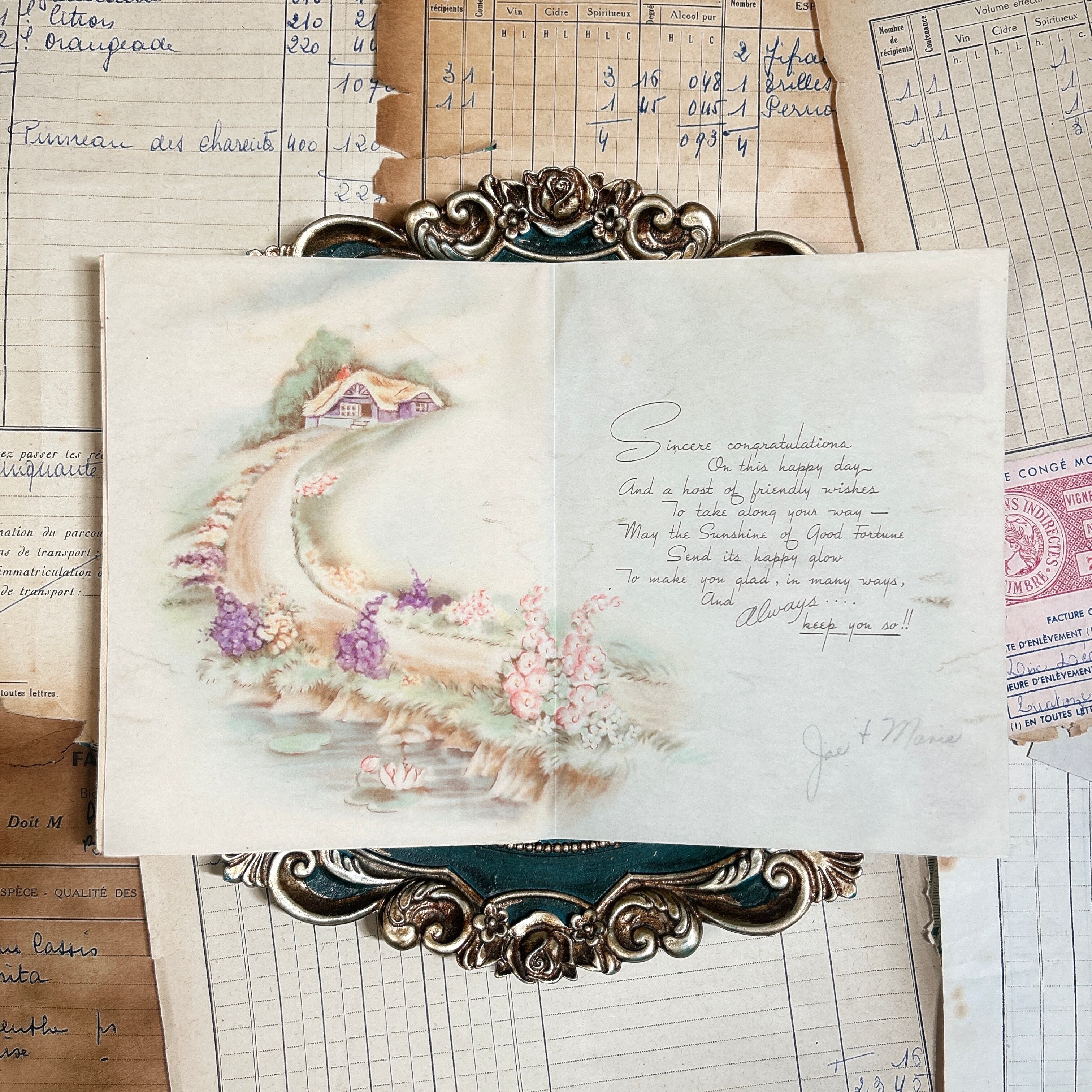 紙質や色合いには年月を経た紙ものならではのやわらかな雰囲気があり、現行品にはない素朴な上品さがあります。銀色の縁取りやスカラップ状のデザインも可愛らしく、ヴィンテージカードらしい装飾性を楽しめます。コレクションにはもちろん、ジャンクジャーナルや撮影小物、ディスプレイにも映える存在感があります。