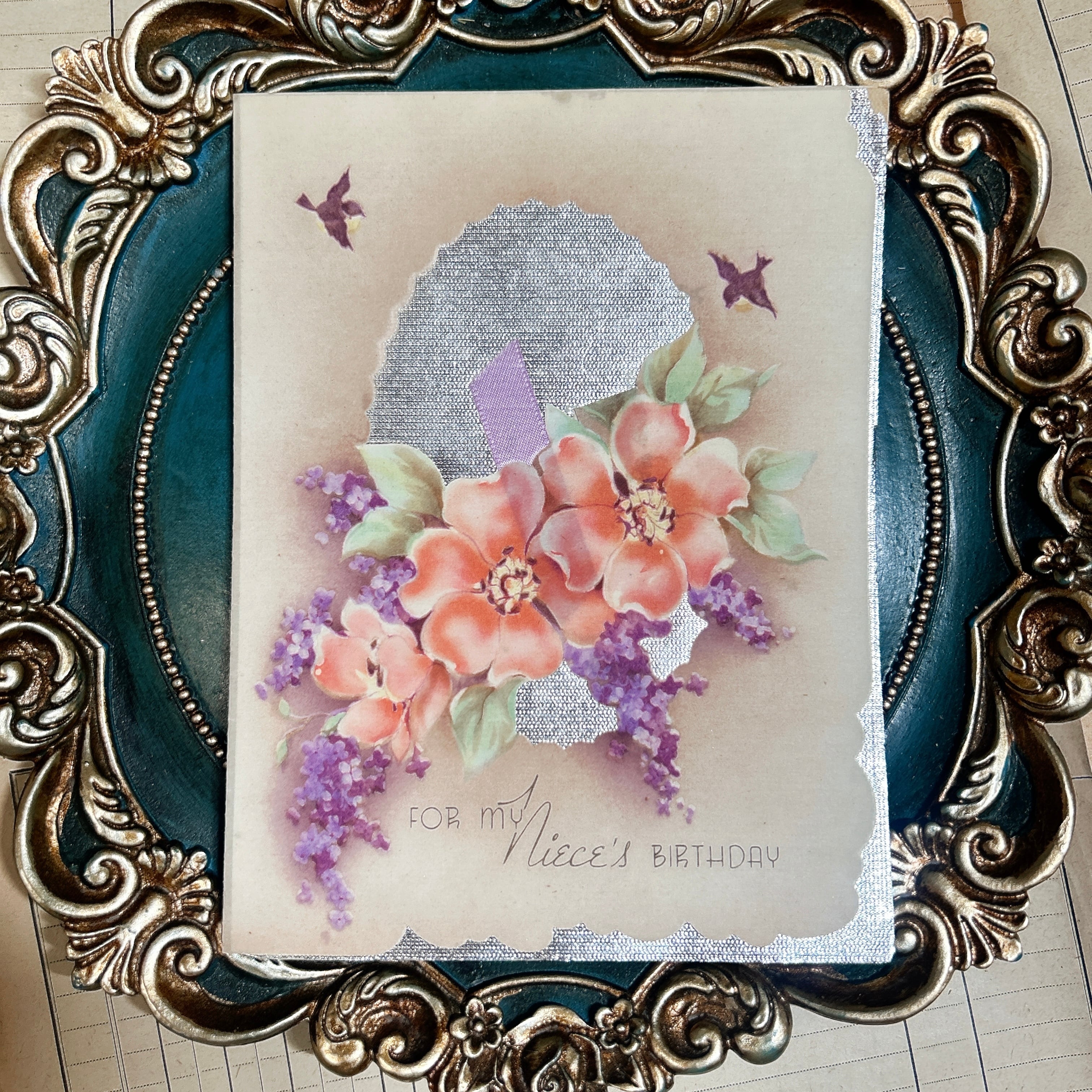 やさしい花模様と銀色の縁取りが印象的な、ヴィンテージのバースデーカードです。表紙には淡いピンクオレンジの花と紫の小花がふんわりと描かれ、ところどころに紫の小鳥が舞う愛らしい構図になっています。背景には繊細なシルバーの装飾が重ねられており、控えめながらもしっかり華やかさのある一枚です。下部には「For My Niece’s Birthday」と記されており、姪へ贈るためのカードらしい、やわらかく親しみのある雰囲気が感じられます。