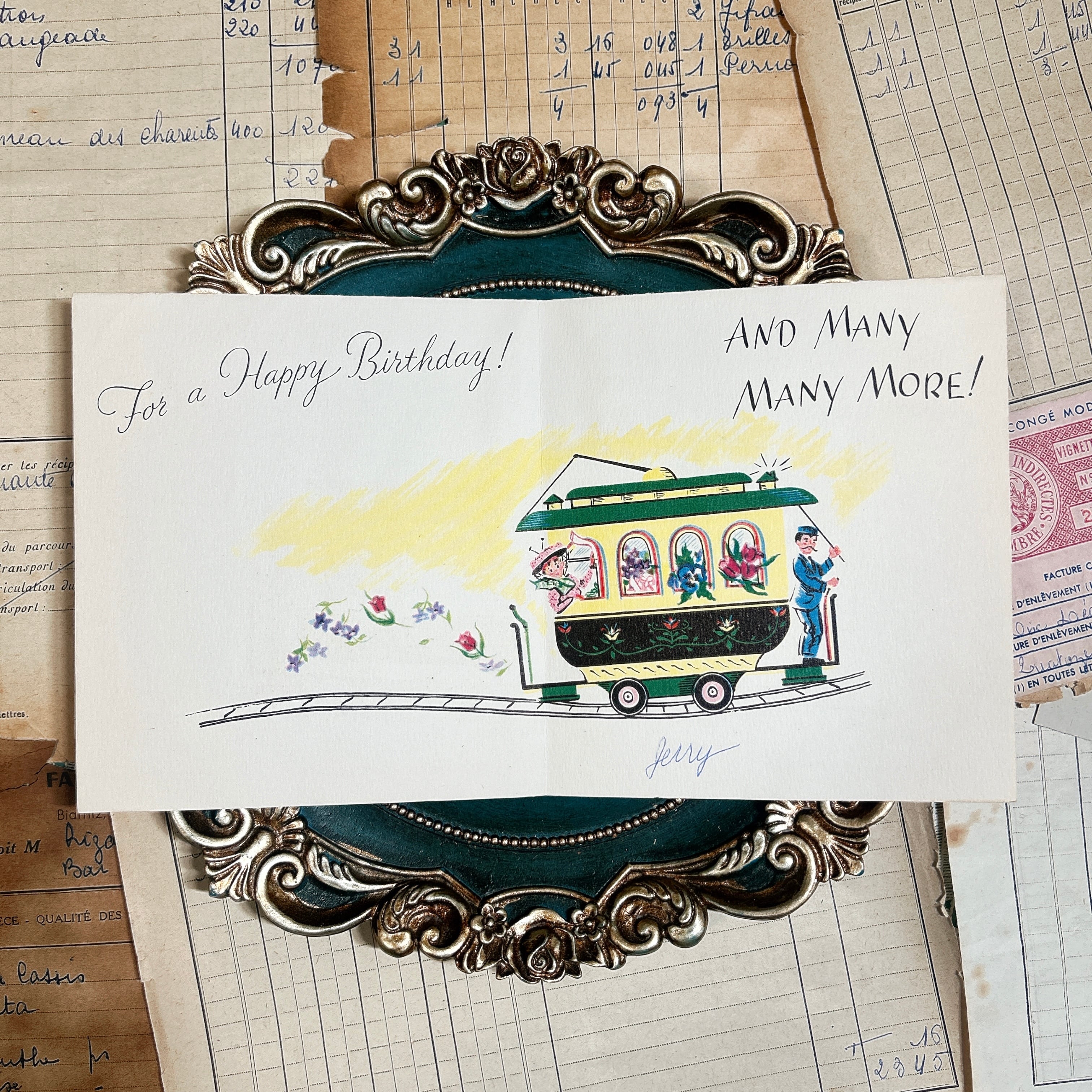 見開き内側ではトロリーがそのまま走り抜けるような構図になっており、「For a Happy Birthday! AND MANY MANY MORE!」というメッセージが大きく入っています。左から右へ流れる線路と、小さな花を後ろに散らしながら進む車両の絵柄が続いていて、カード全体でひとつの場面を作っているのが魅力です。内側下部には青インクで「Jerry」と手書きのサインがあり、実際に誰かの誕生日のために贈られた一点物らしい温度も感じられます。