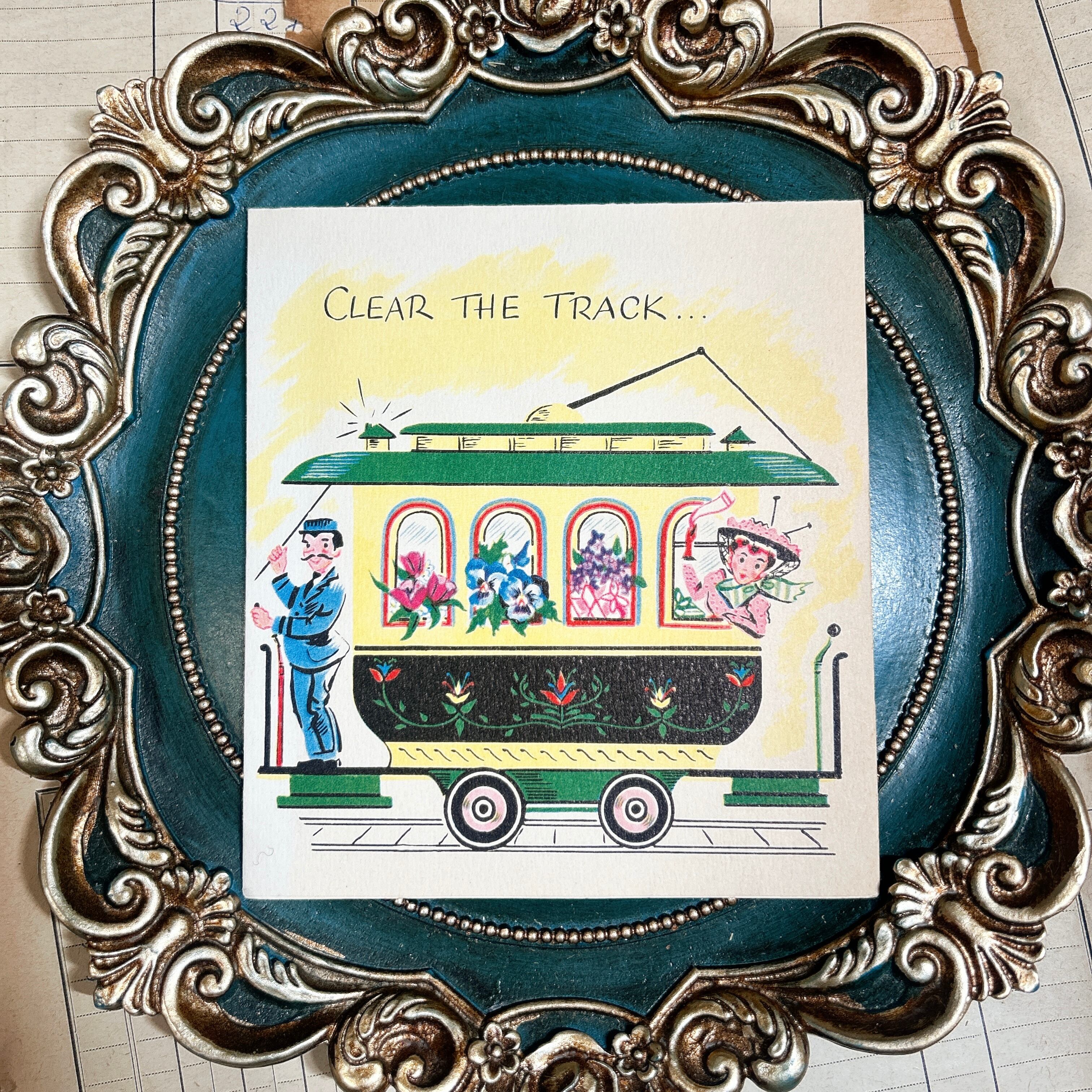 ヴィンテージらしい遊び心あふれるデザインが目を引く、ユニークなバースデーカードです。表紙には「CLEAR THE TRACK…」の文字とともに、花で飾られた小さなトロリーが描かれており、車掌のような男性と、車窓から身を乗り出す帽子姿の女性の姿がなんとも軽やかで楽しい雰囲気です。グリーンやイエローを基調に、ピンクやブルーの花が差し色になっていて、明るく陽気なアメリカンヴィンテージらしい色づかいを楽しめます。