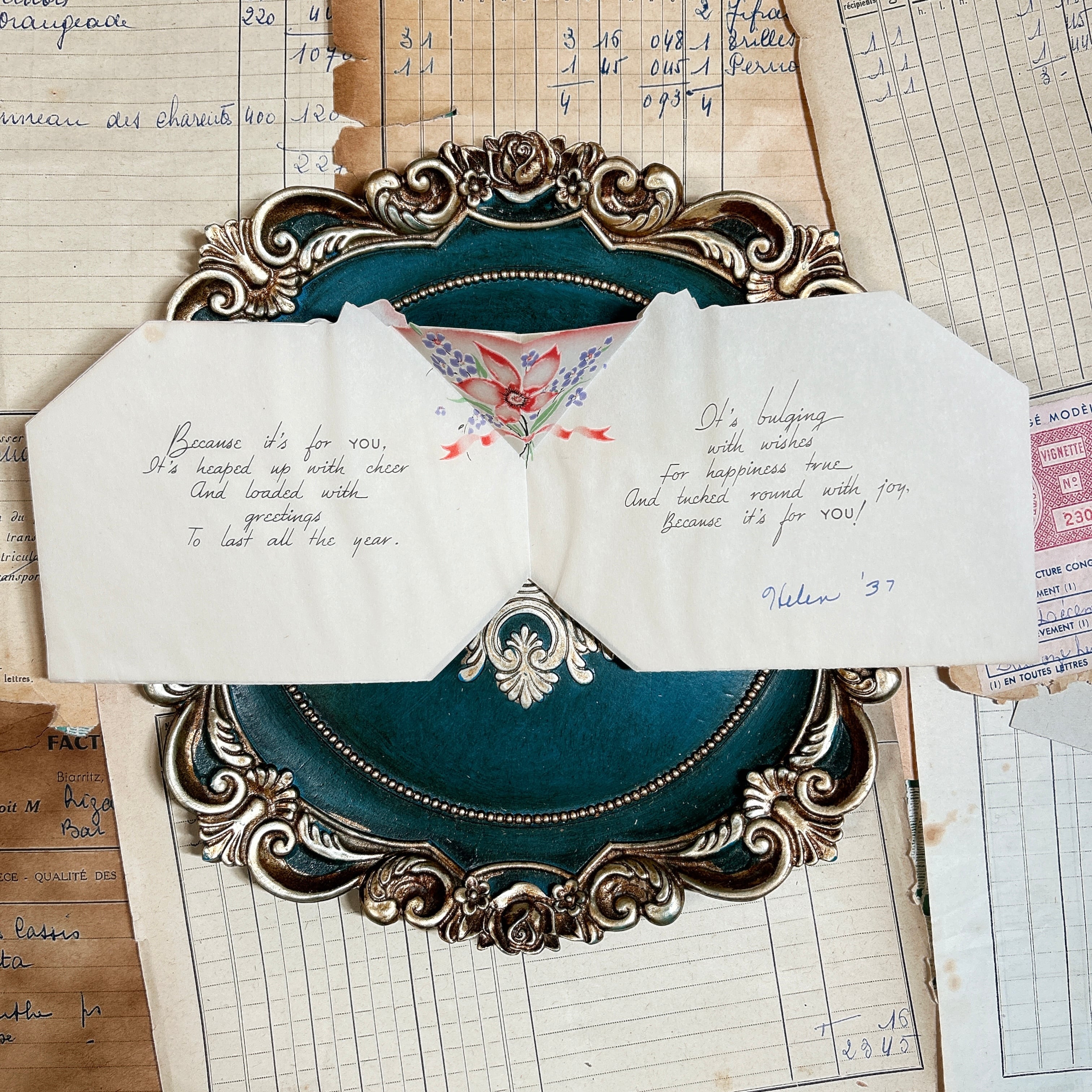 内側は変形の折り込み仕様になっており、左右に開くと中央に花のモチーフが現れ、メッセージ部分にも“Because it’s for YOU”という言葉が添えられています。贈り物を開く瞬間のような演出が楽しめる、手の込んだデザインです。外側の華やかさに対して、内側はすっきりとした余白が生かされており、繊細な書体やレイアウトが上品な雰囲気をつくっています。青インクで「Helen ’37」と書き込みがあり、当時実際に贈られた一点ものならではの存在感も魅力です。