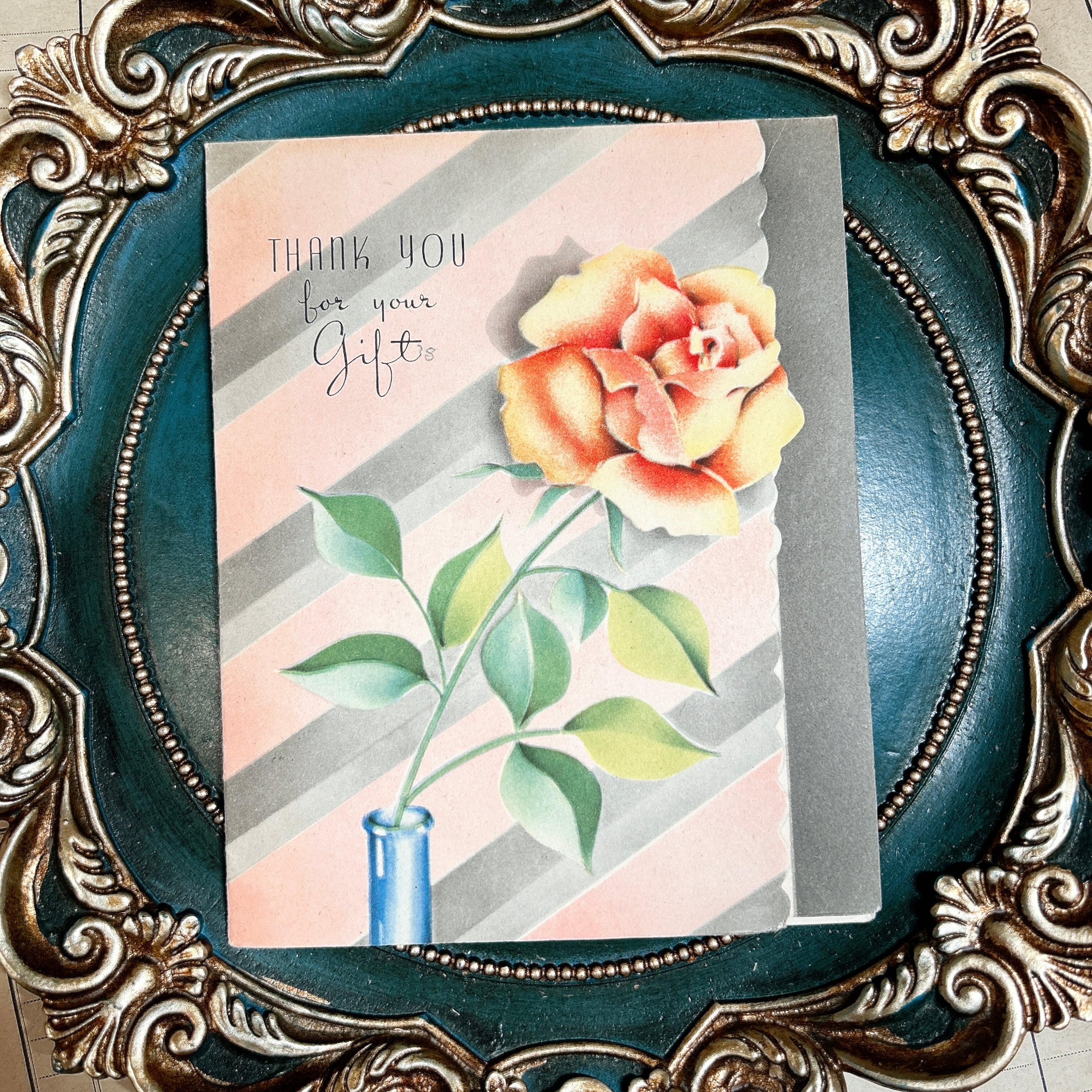 やわらかなピンクとグレーの斜めストライプを背景に、オレンジがかった大輪のバラが印象的に描かれたヴィンテージのサンキューカードです。表紙には「THANK YOU for your Gifts」の文字が入り、細身のタイポグラフィと花の優雅な組み合わせが上品で落ち着いた雰囲気をつくっています。青い花瓶からすっと伸びる茎や葉の配置も美しく、華やかさがありながら甘すぎない、大人っぽいデザインです。