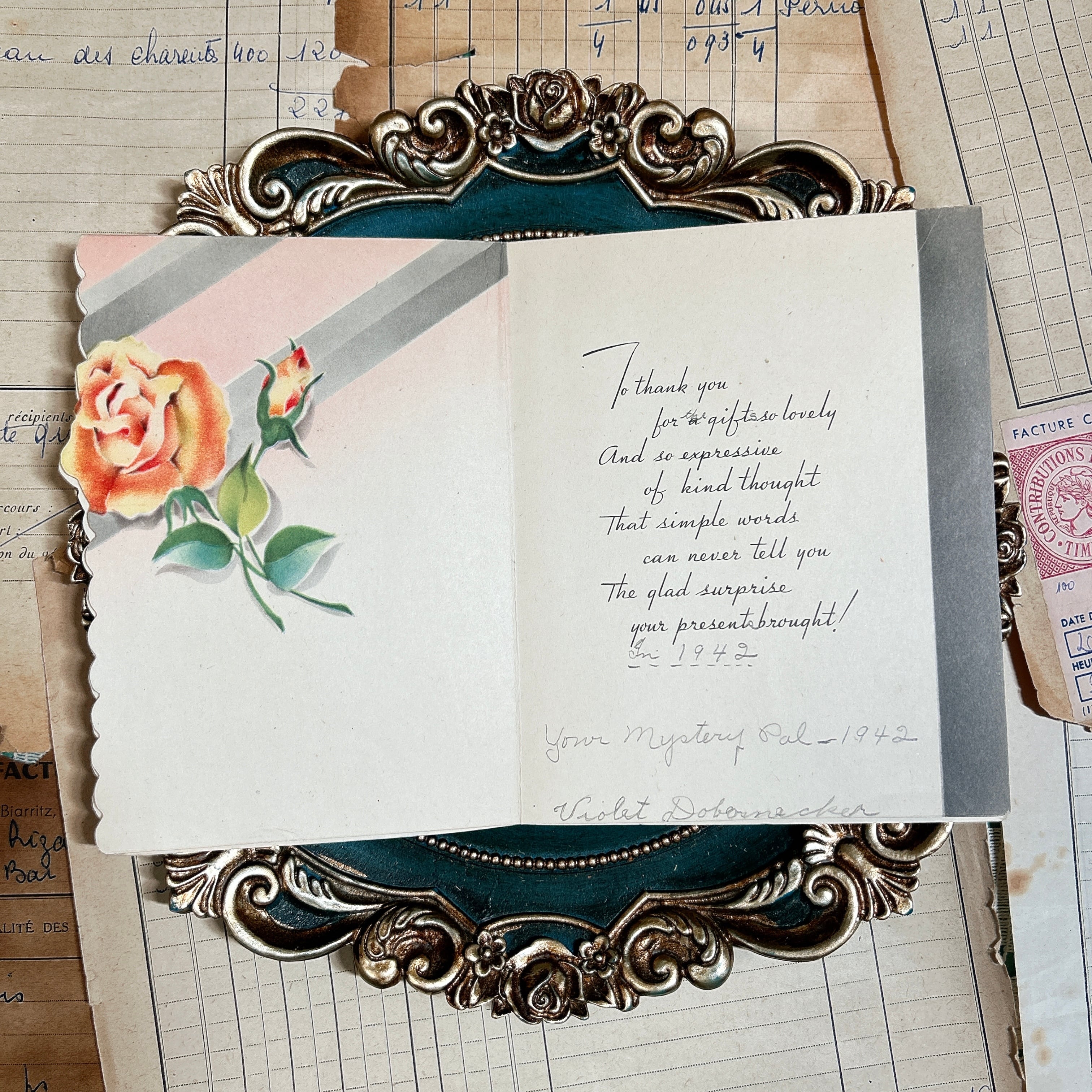 内側には同じバラのモチーフがさりげなく続き、贈り物への感謝を綴った英文メッセージが印刷されています。さらに手書きで「1942」の年号や「Your Mystery Pal - 1942」、署名と思われる書き込みが加えられており、当時実際にやり取りされた一点ものとしての魅力を感じられます。印刷されたメッセージに重なるように個人の筆跡が残っているため、単なるカードというより、時代の空気を閉じ込めた紙もの資料のような味わいがあります。