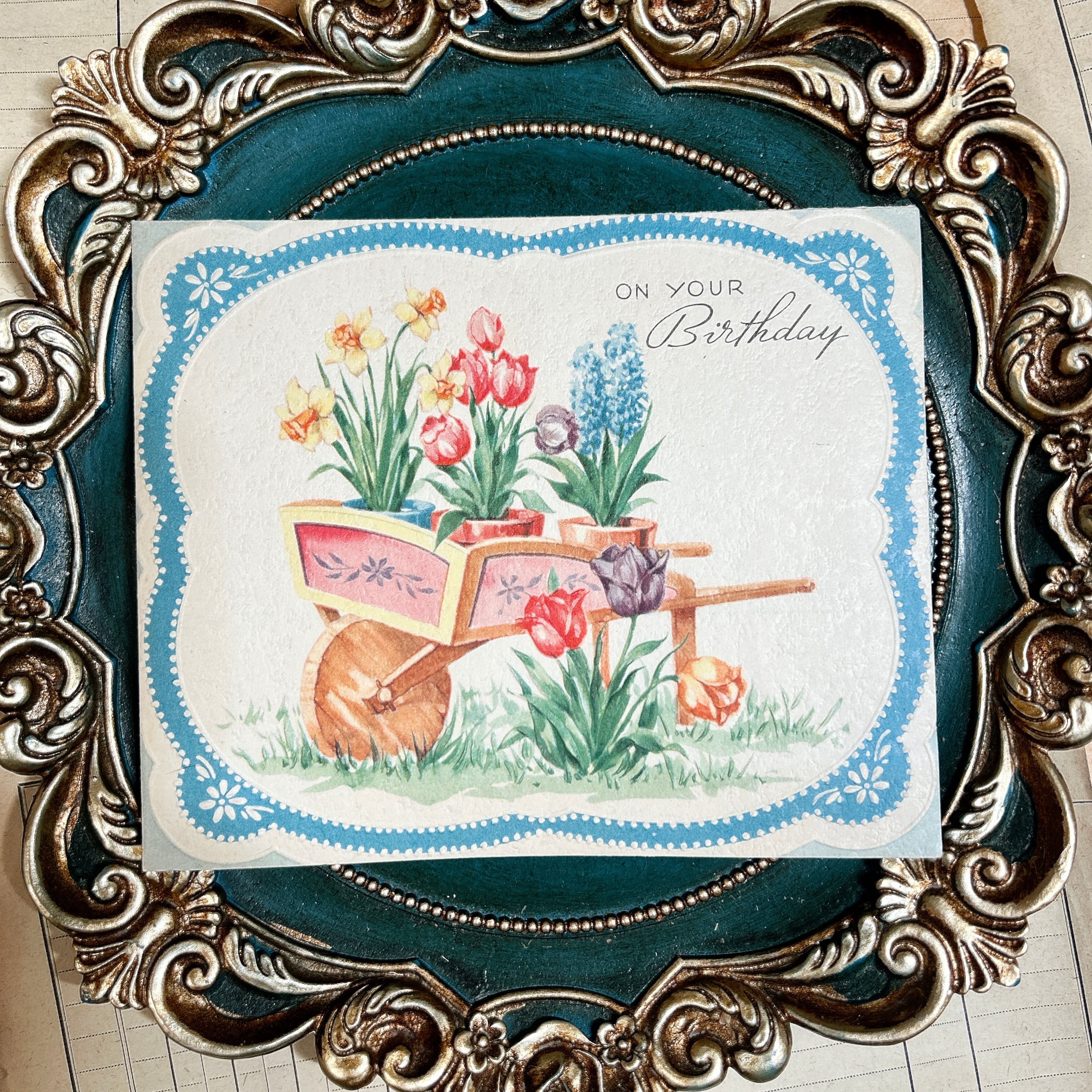 水色のスカラップフレームが印象的な、爽やかで優しい雰囲気のヴィンテージバースデーカードです。表紙には手押し車いっぱいに春の花々が描かれており、黄色の水仙、赤やピンク、紫のチューリップ、青いムスカリのような花がバランスよく寄せられています。木製の車輪や花器のやわらかな色づかいも可愛らしく、庭先のひとこまを切り取ったようなのどかな一枚です。「On Your Birthday」の文字も上品で、甘すぎず、季節感のある花柄カードをお探しの方にぴったりです。