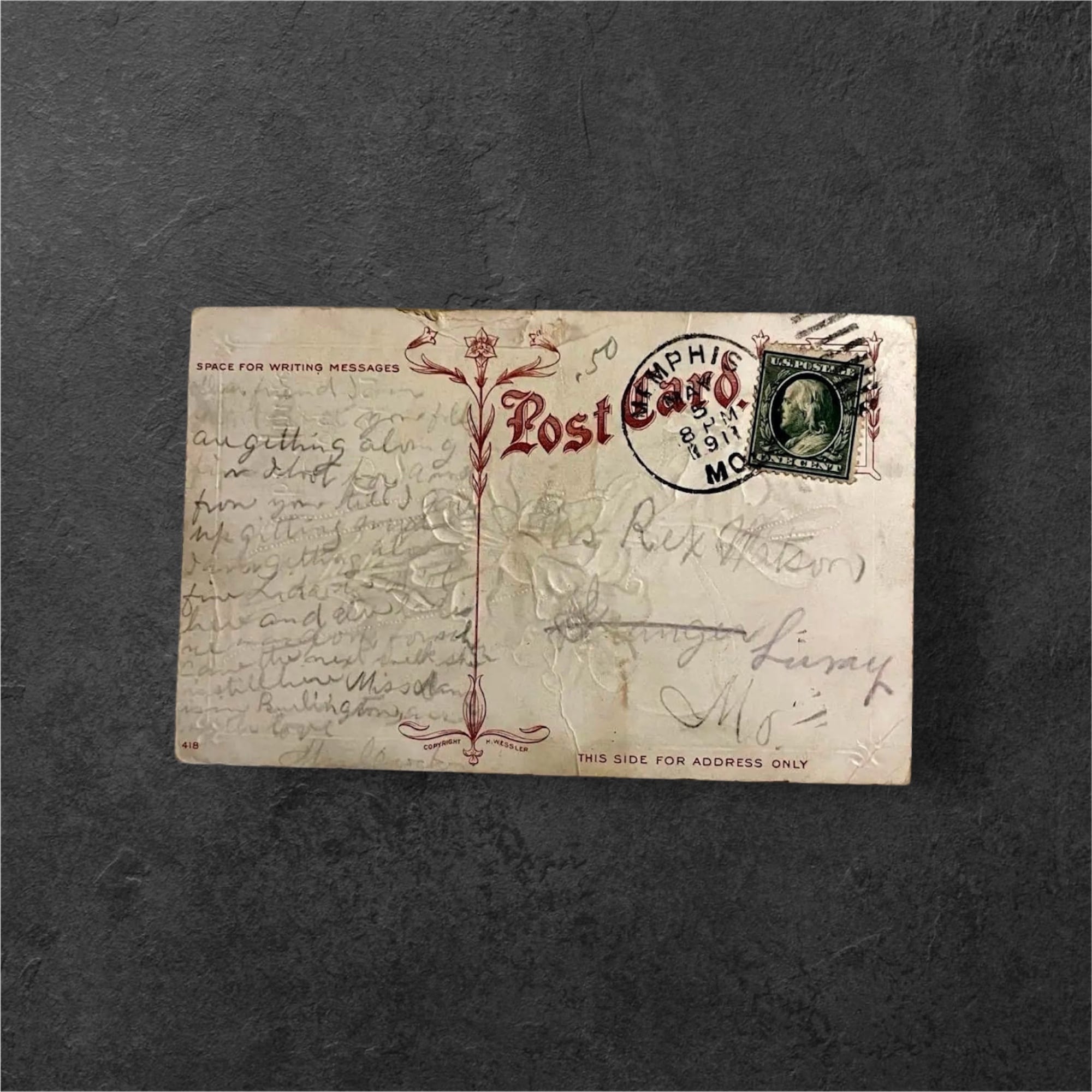 裏面には実際に使用された手書きのメッセージと消印、切手が残っており、郵送物としての歴史をそのまま伝えています。経年による紙の焼けや擦れ、薄いシミなどは見られますが、それらも含めてアンティークならではの風合いとしてお楽しみいただけます。現代のカードにはない、時間の重なりや人の気配を感じられる一点です。