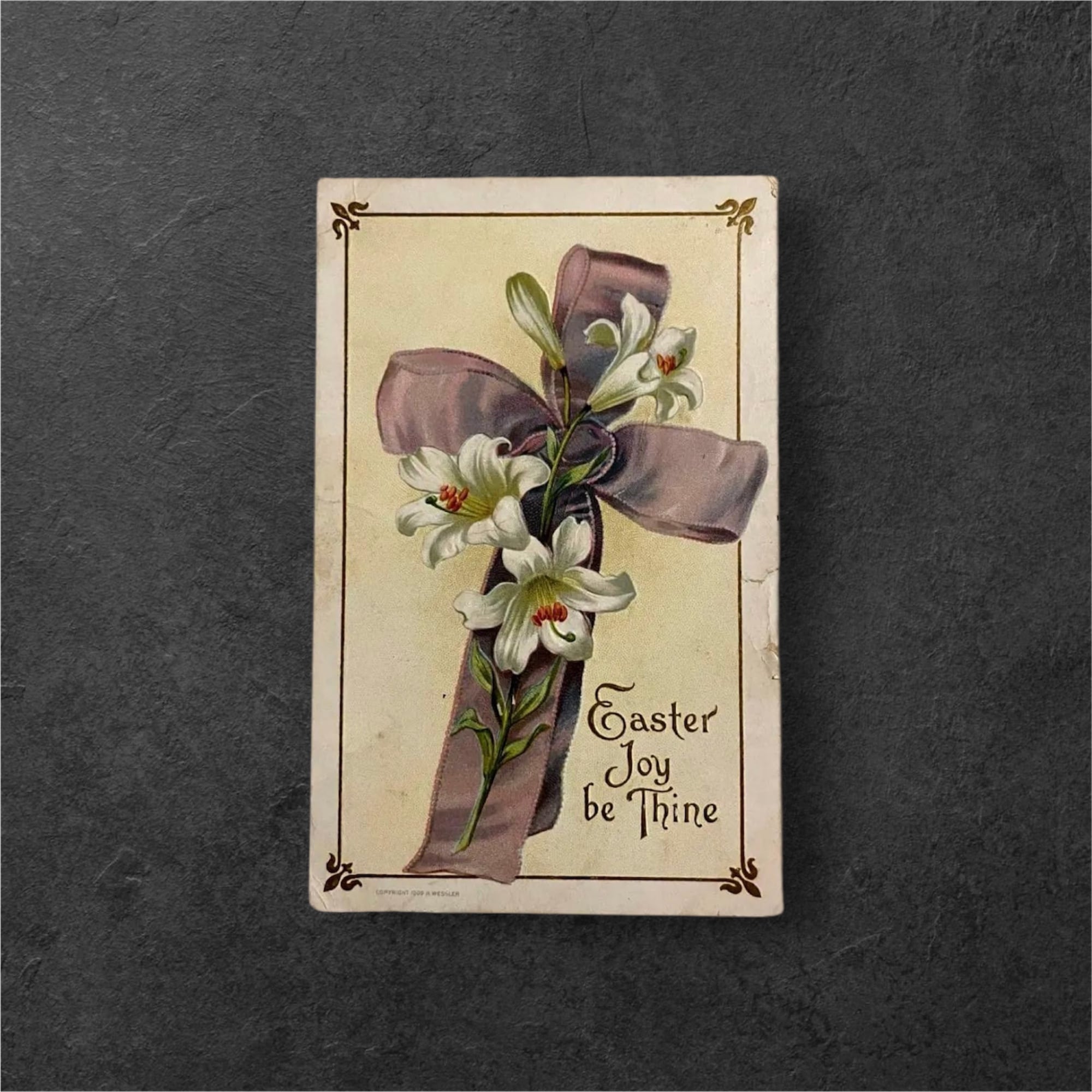 淡いクリーム色の台紙に、リボンで結ばれたクロスと白百合が描かれた、静謐で敬虔な雰囲気のアンティーク・イースターカードです。やわらかな陰影で表現された紫がかったリボンと、繊細に描き込まれた百合の花は、復活祭ならではの祈りと希望を象徴するモチーフとして、時代を超えた美しさを感じさせます。四隅の装飾枠やレタリングも、当時の印刷技術ならではの品のある佇まいです。