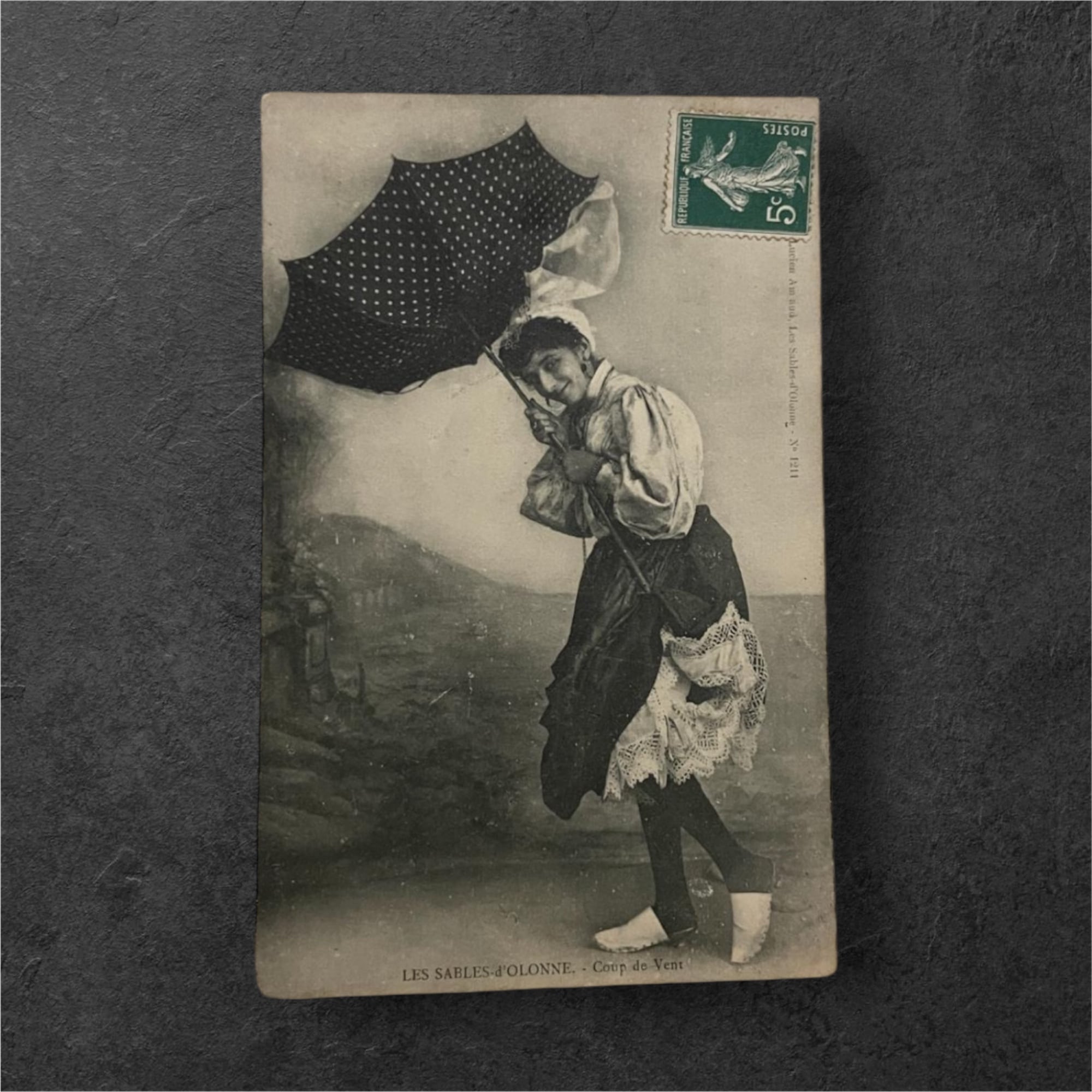 フランスの海辺の町、レ・サーブル=ドロンヌを題材にしたヴィンテージポストカードです。風に煽られながら水玉模様のパラソルを必死に押さえる少女の姿が写されており、日常の一瞬を切り取ったような生き生きとした表情と動きが印象的な一枚です。背景には荒れた空と海辺の風景が広がり、当時の空気感や天候までもが伝わってくるような写真です。