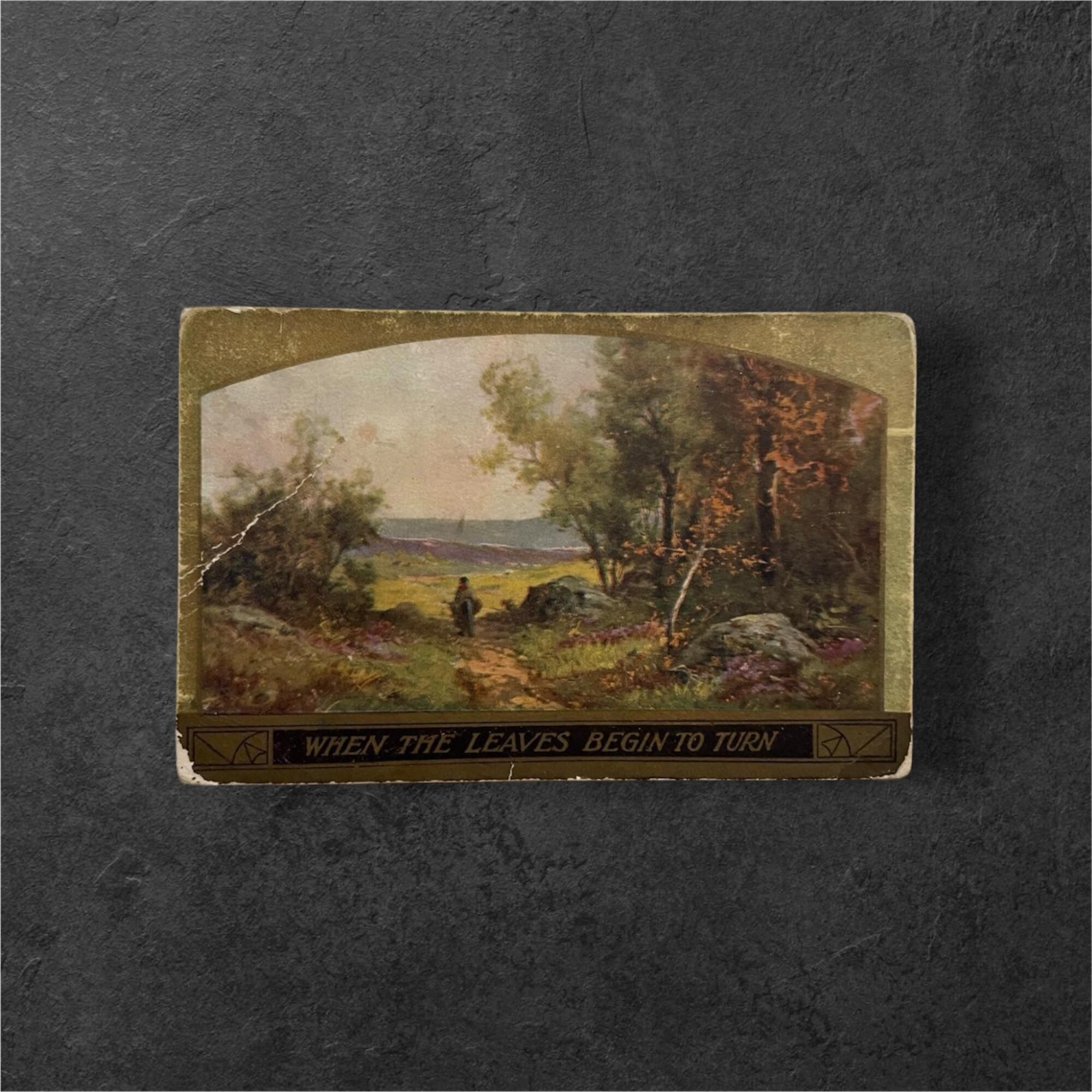 カードの下部には「WHEN THE LEAVES BEGIN TO TURN」と印字されており、葉が色づき始める季節の空気をそのまま言葉にしたような、詩情あるデザインになっています。文字部分は黒地に金色風の装飾枠が添えられており、絵柄全体を引き締めつつ、クラシカルで上品な印象を与えています。四隅の丸みや紙の厚み、印刷のやわらかな発色にもアンティークらしい魅力があり、紙ものとしての存在感もしっかり感じられます。