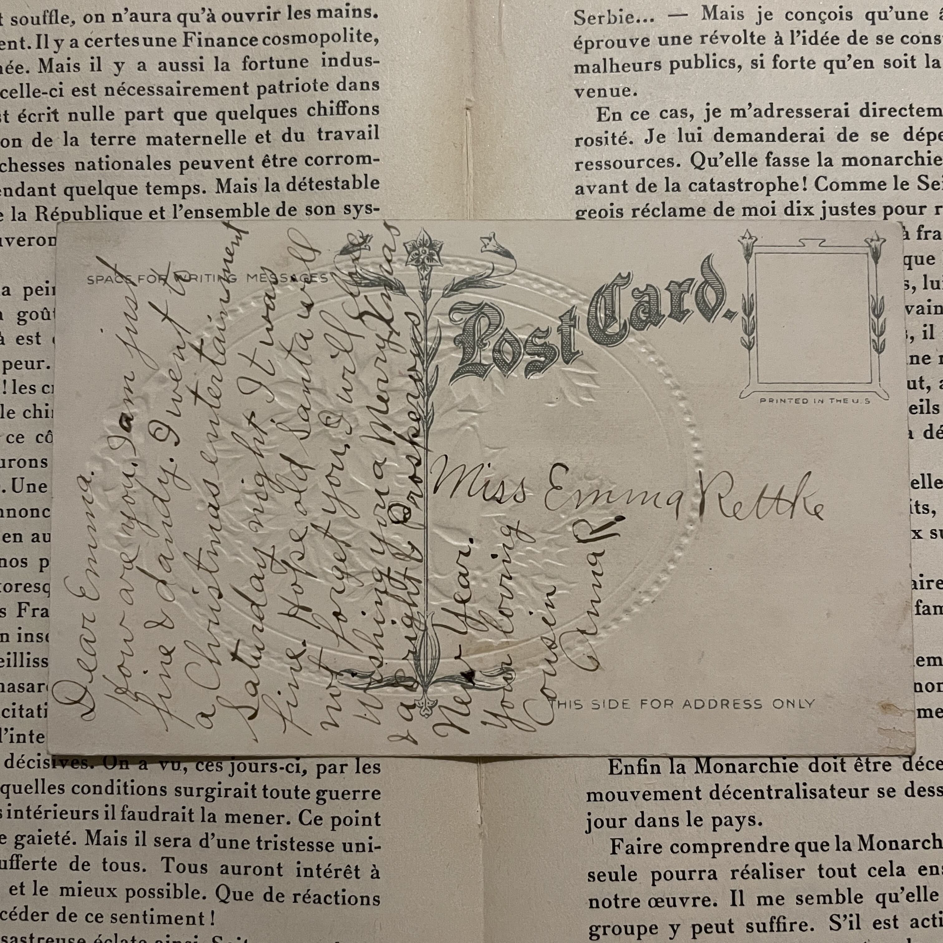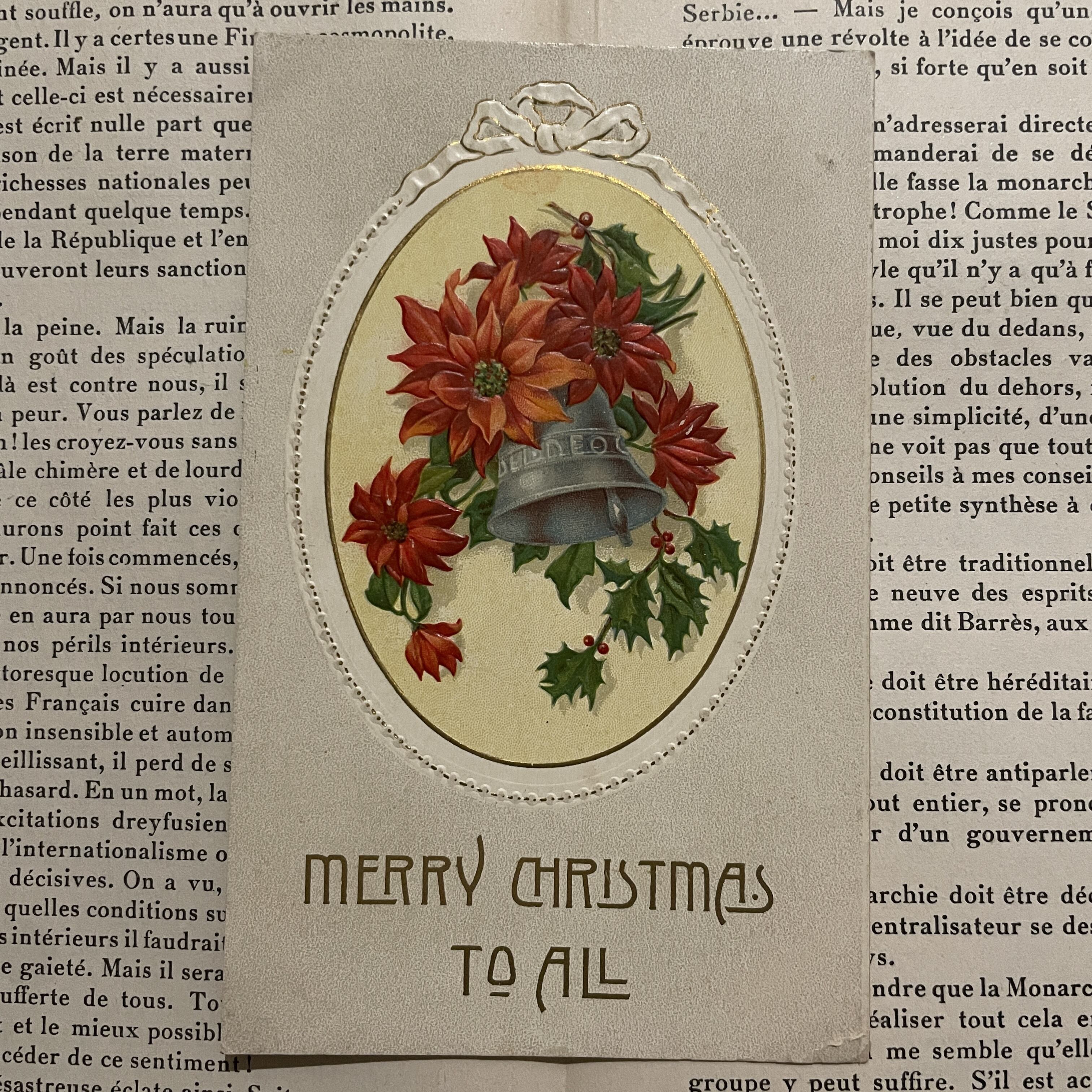 こちらは、クリスマスのベルが描かれたアンティークポストカードです。ゴールドや赤の装飾が施されたクリスマスベルは、祝福と喜びの象徴としてホリデーシーズンを華やかに彩ります。ヨーロッパでは、ベルの音が幸運を呼び込むと信じられており、クリスマスの飾りとして広く使われてきました。その音色は、人々に愛と平和のメッセージを伝えるものとされています。