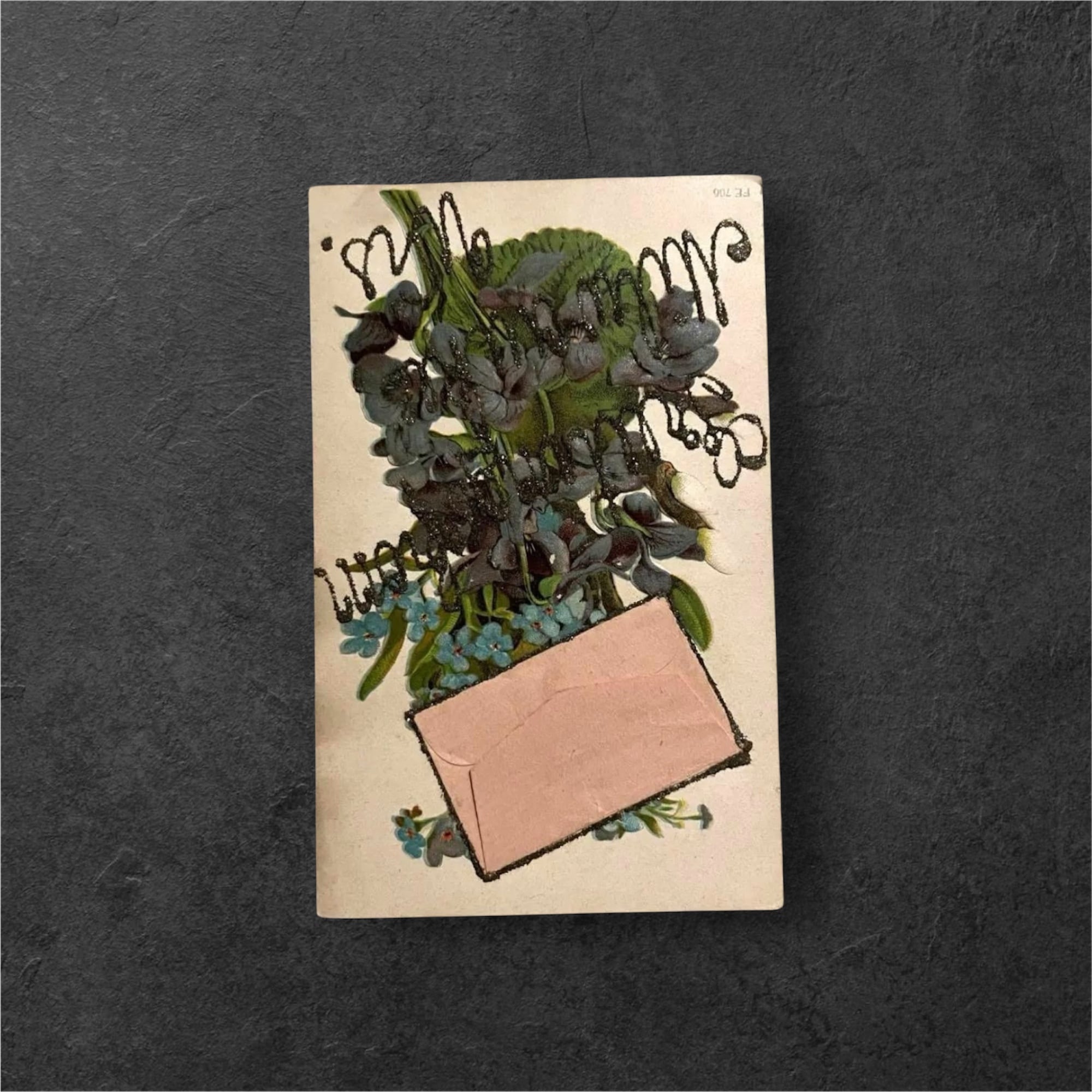 宗教的モチーフと花の装飾が調和したデザインは、コレクションとしてはもちろん、額装してインテリアとして飾ったり、撮影小物やコラージュ素材としてもおすすめです。過去の誰かの想いをそっと受け取るような感覚を楽しめる、唯一無二のヴィンテージカードです。