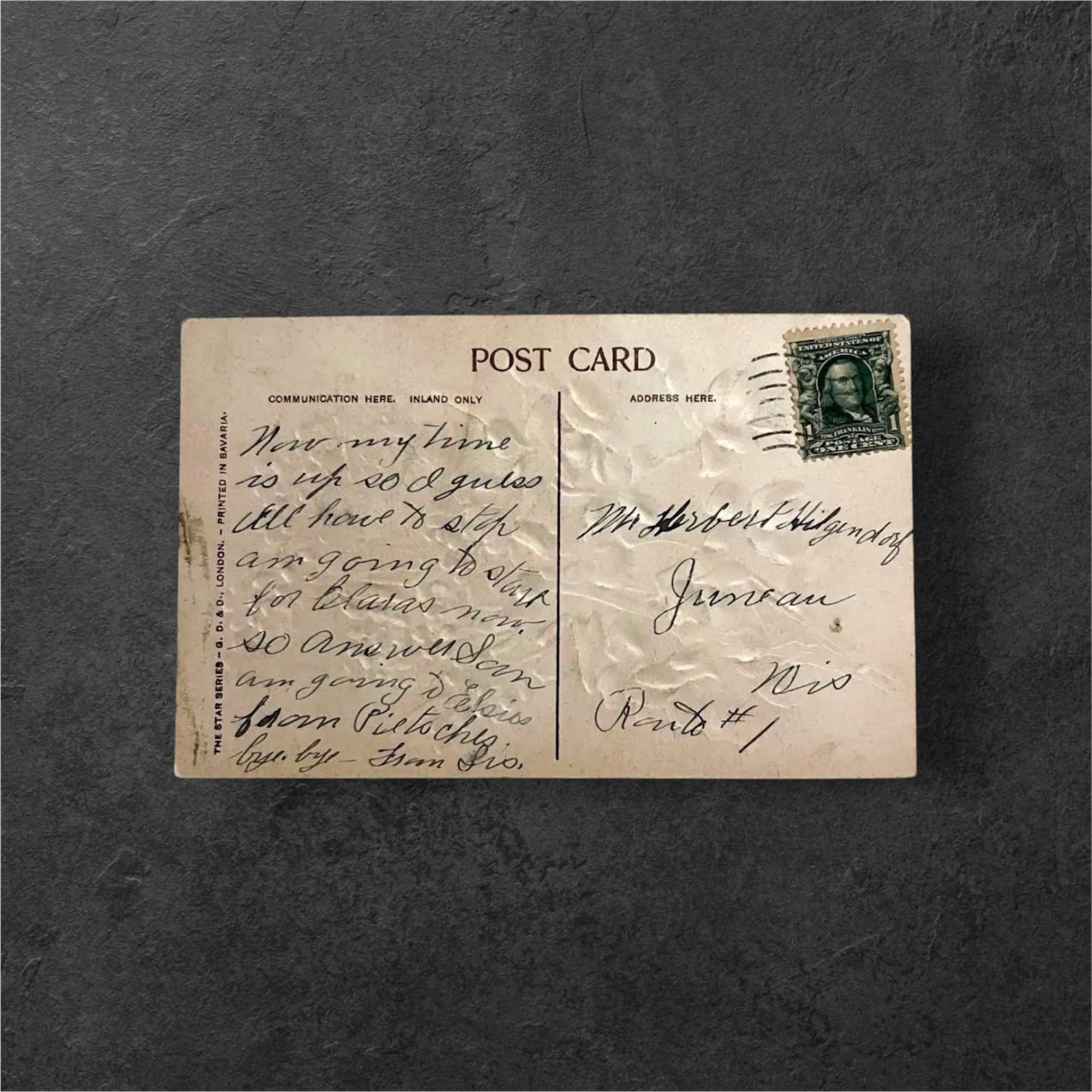 裏面には実際に使用された痕跡が残っており、手書きのメッセージ、消印、切手が当時のまま残存しています。文字のかすれや紙の凹凸、経年によるシミや縁の摩耗なども見られますが、それらは長い時間を旅してきた証として、このカードにしかない表情を与えています。現在では再現できない、紙そのものの風合いやインクのにじみも魅力のひとつです。