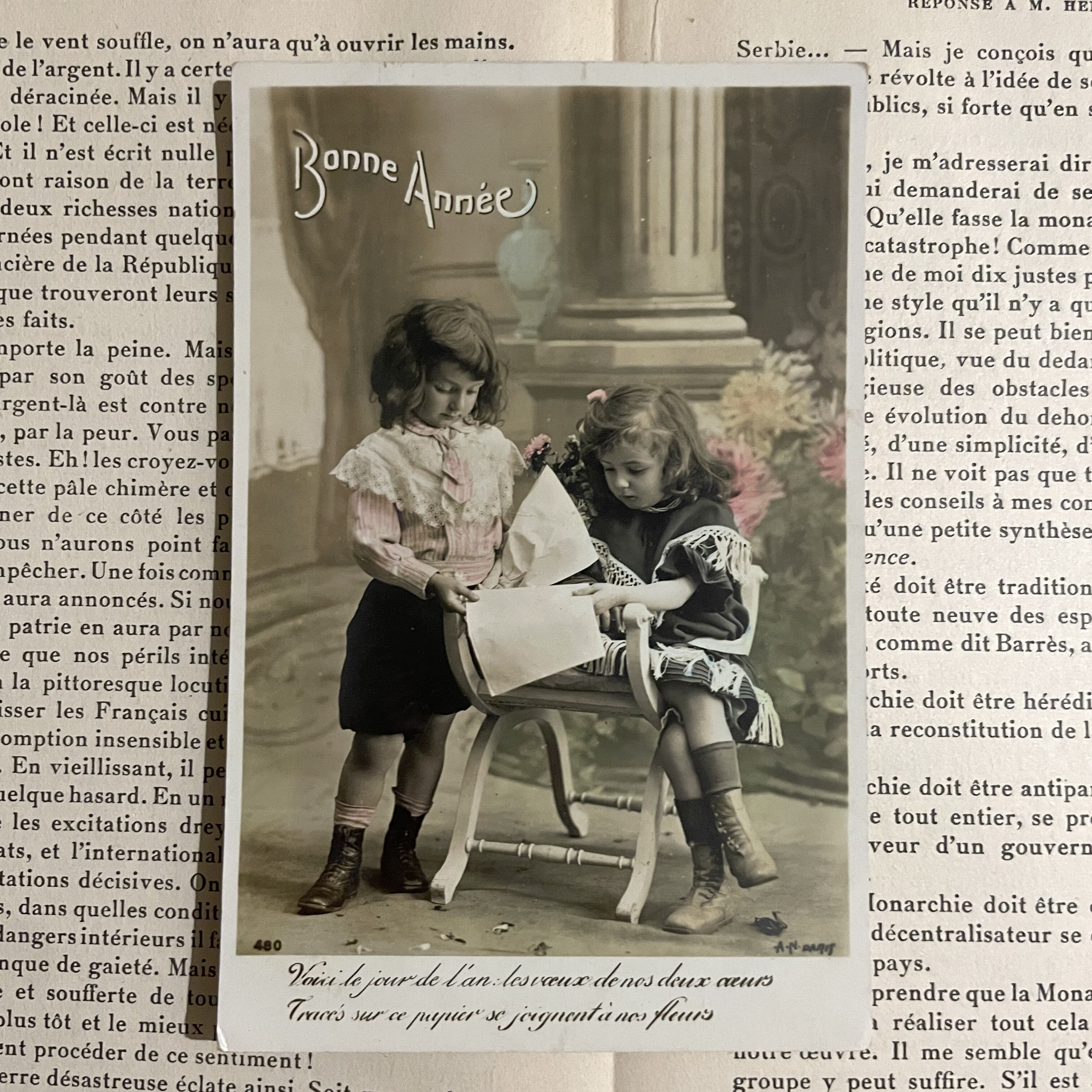 こちらは、仲睦まじい女の子同士が描かれたアンティークポストカードです。可愛らしい服装をした二人の少女が、微笑み合ったり寄り添ったりしている様子は、見ているだけで心が温かくなるような、ほのぼのとした優しい雰囲気を醸し出しています。女の子同士の友情や無邪気な瞬間を切り取ったデザインは、昔の人々が愛情や絆を大切にしていたことを感じさせてくれます。