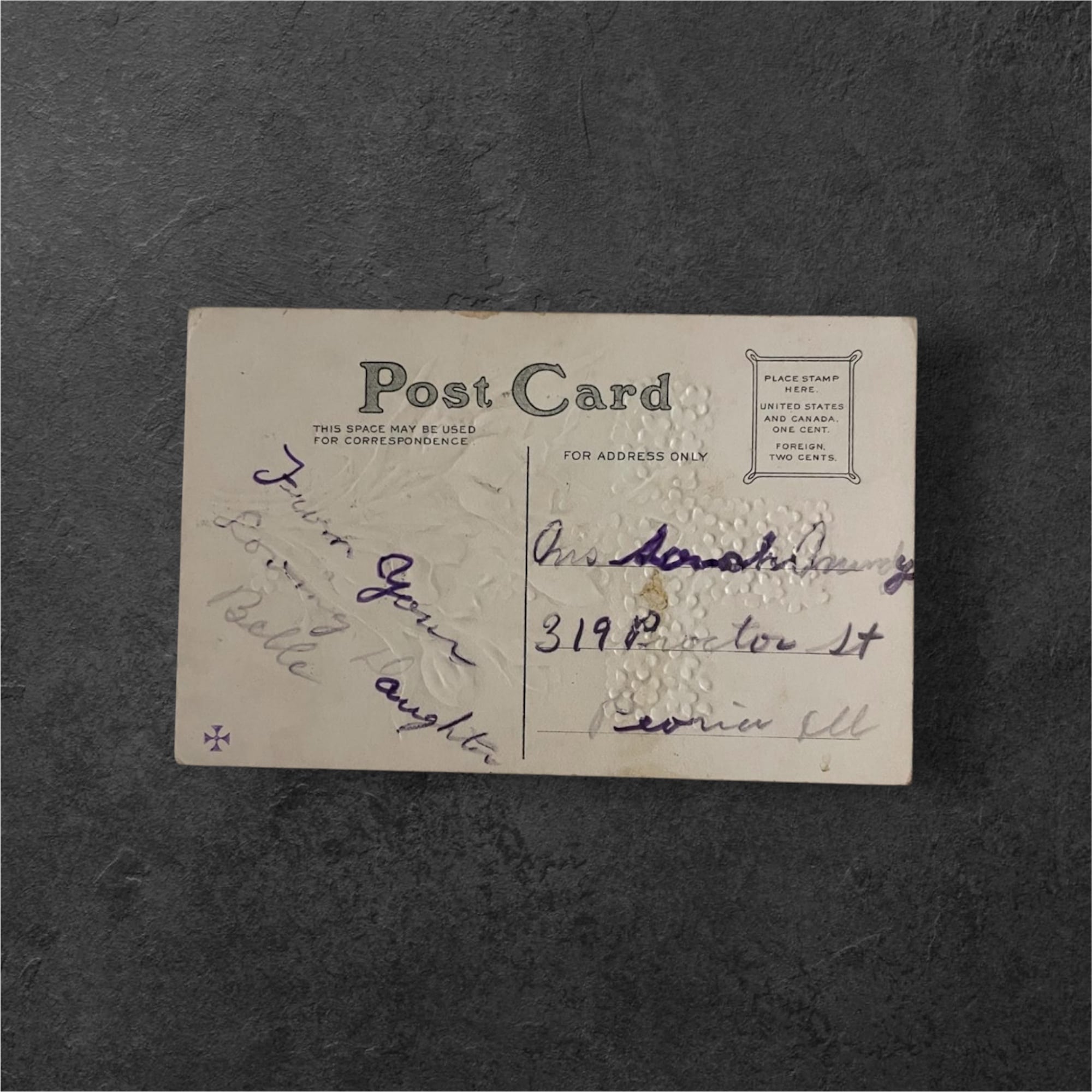 裏面には実際に使用された形跡があり、筆記されたメッセージや住所、郵便枠のデザイン、型押し模様がそのまま残っています。紙質はやや厚みがあり、経年によるヤケや薄いシミ、エンボス部分の凹凸の摩耗などが見られますが、それらも長い時間を旅してきた証として味わい深い状態です。