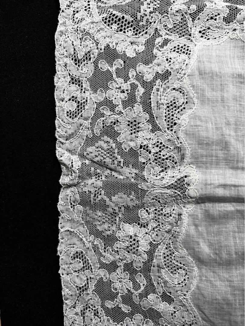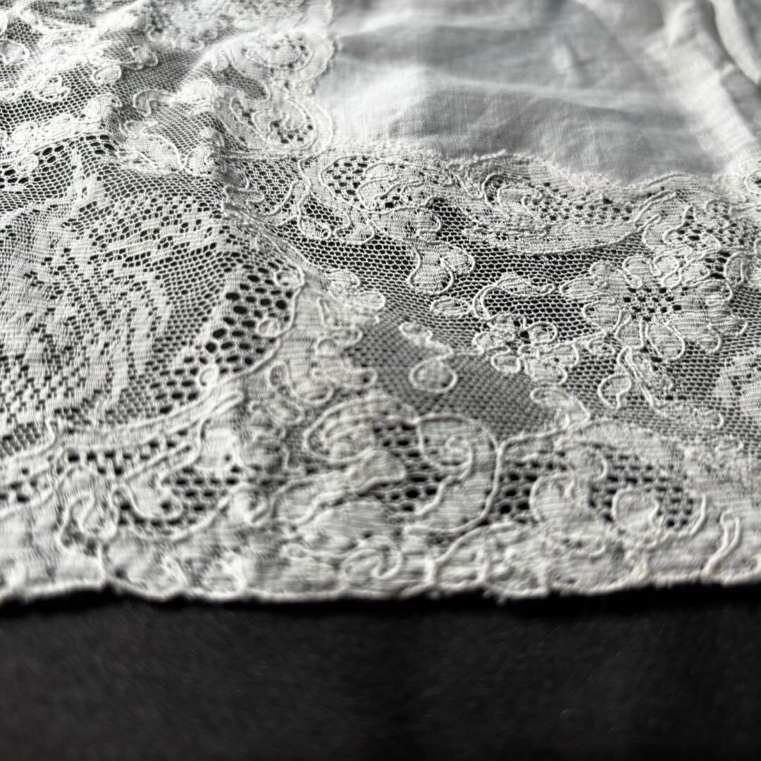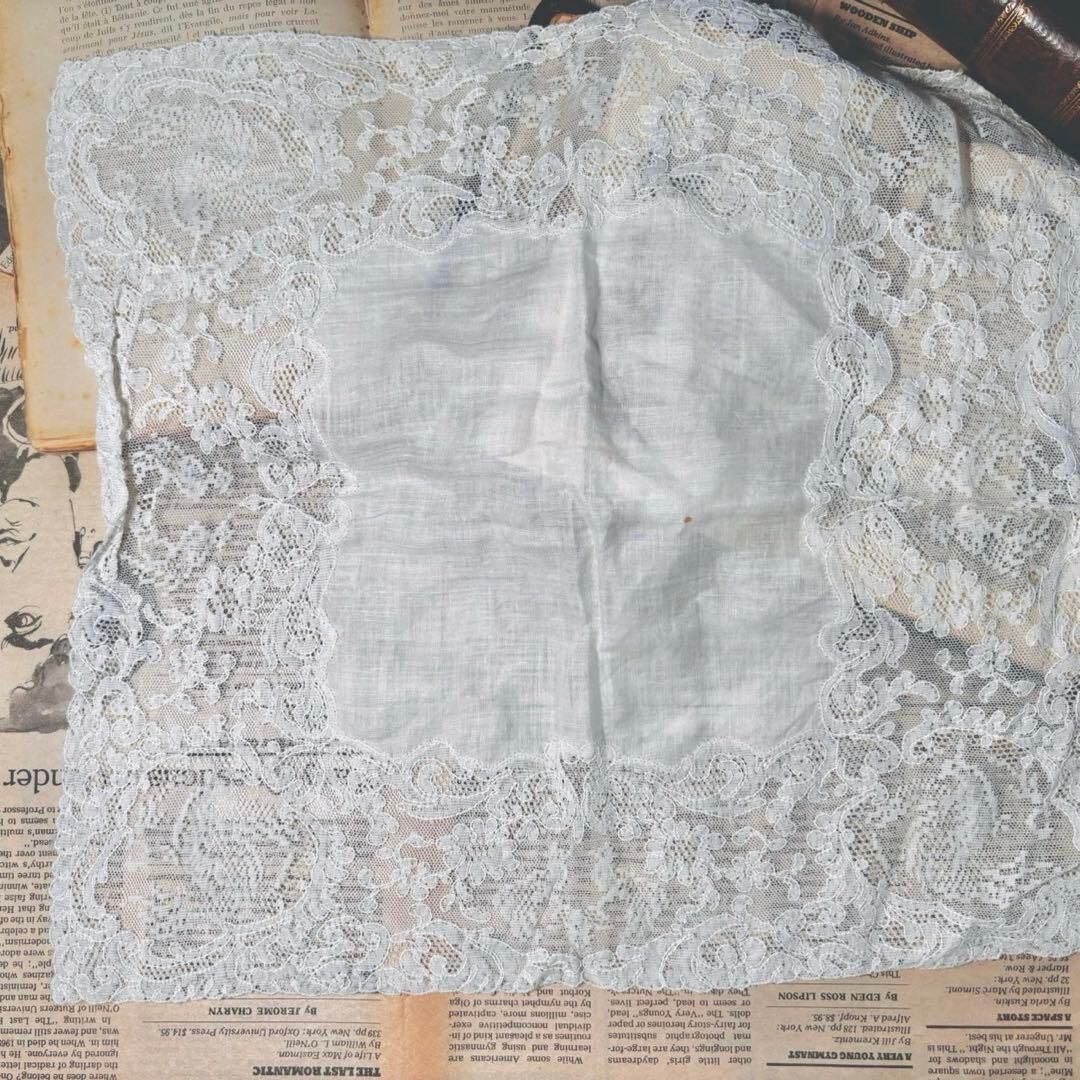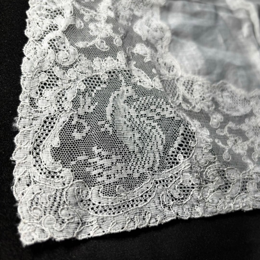 こちらは繊細で美しいアンティークのレースハンカチです。縁取りには緻密な手仕事が光るフランス製と思われるレースが施されており、ヨーロッパのクラシックな装飾文化を感じさせる逸品です。このハンカチの特徴的な部分は、優雅な花柄モチーフがレース全体にあしらわれていることです。おそらく19世紀末から20世紀初頭に制作されたものであり、当時の上流階級の女性たちが愛用していたエレガントなアイテムの一つだったと推測されます。