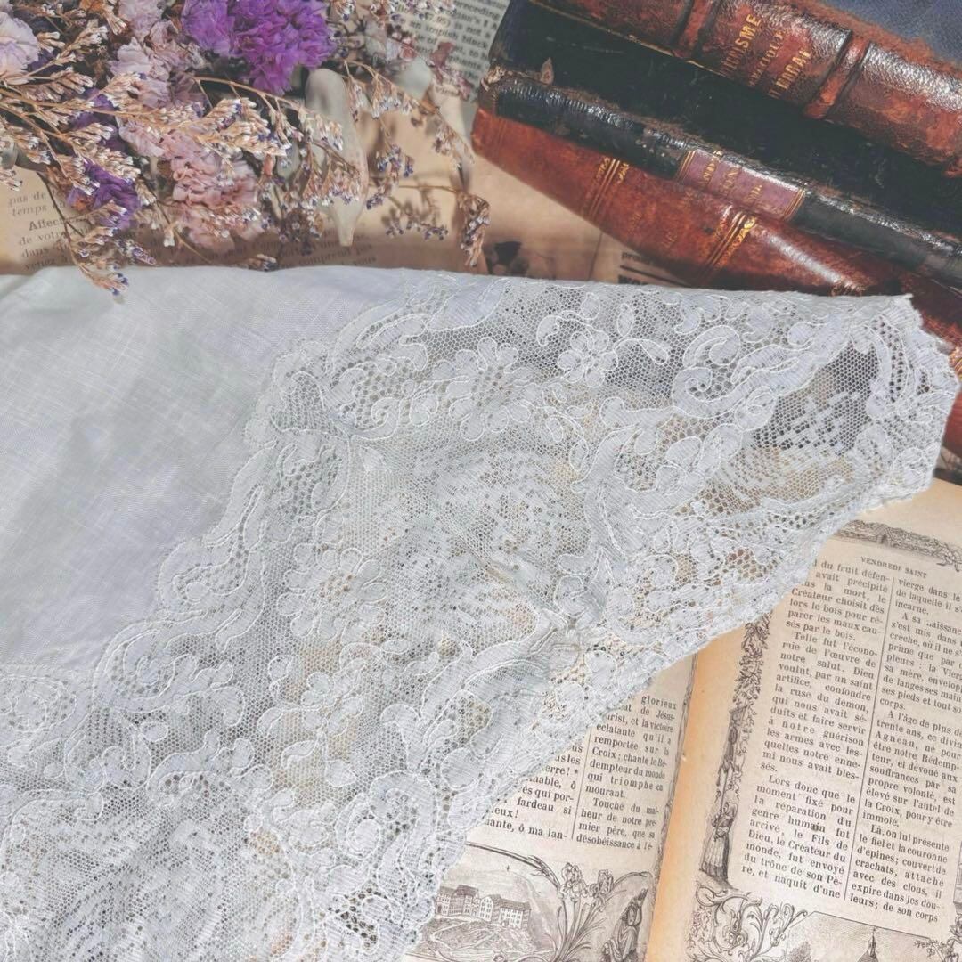 素材は柔らかなリネンとレースが組み合わされており、その丁寧な仕上がりから高い職人技術をうかがい知ることができます。状態はアンティークとして非常に良好で、特に目立つダメージはなく、現在でも観賞用や特別なシーンでお使いいただけます。また、こうしたハンカチは贈り物にも最適で、大切な方への気品あるギフトとしても喜ばれることでしょう。